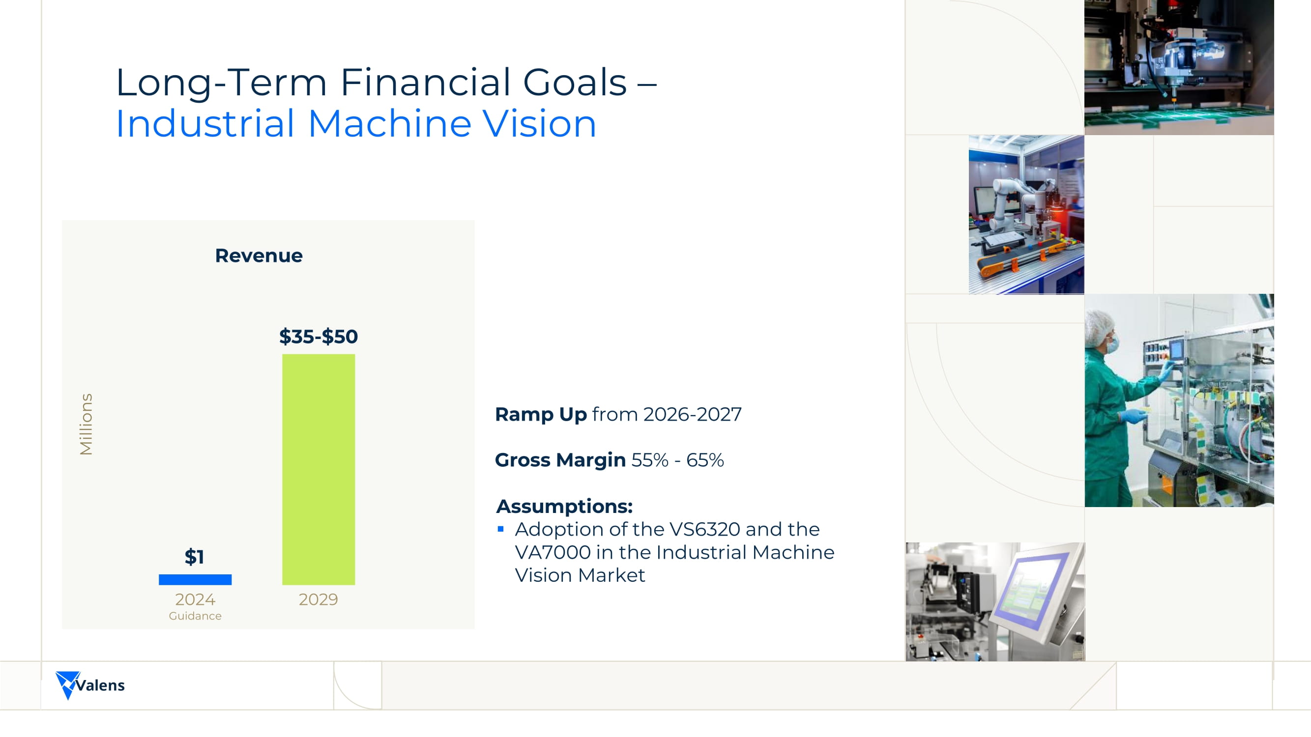 收入百万长期财务目标– Industrial Machine Vision $ 35-$ 50 $ 12024指导2029从2026-2027年毛利率上升55%-65 %假设:▪工业机器视觉市场采用VS6320和VA7000