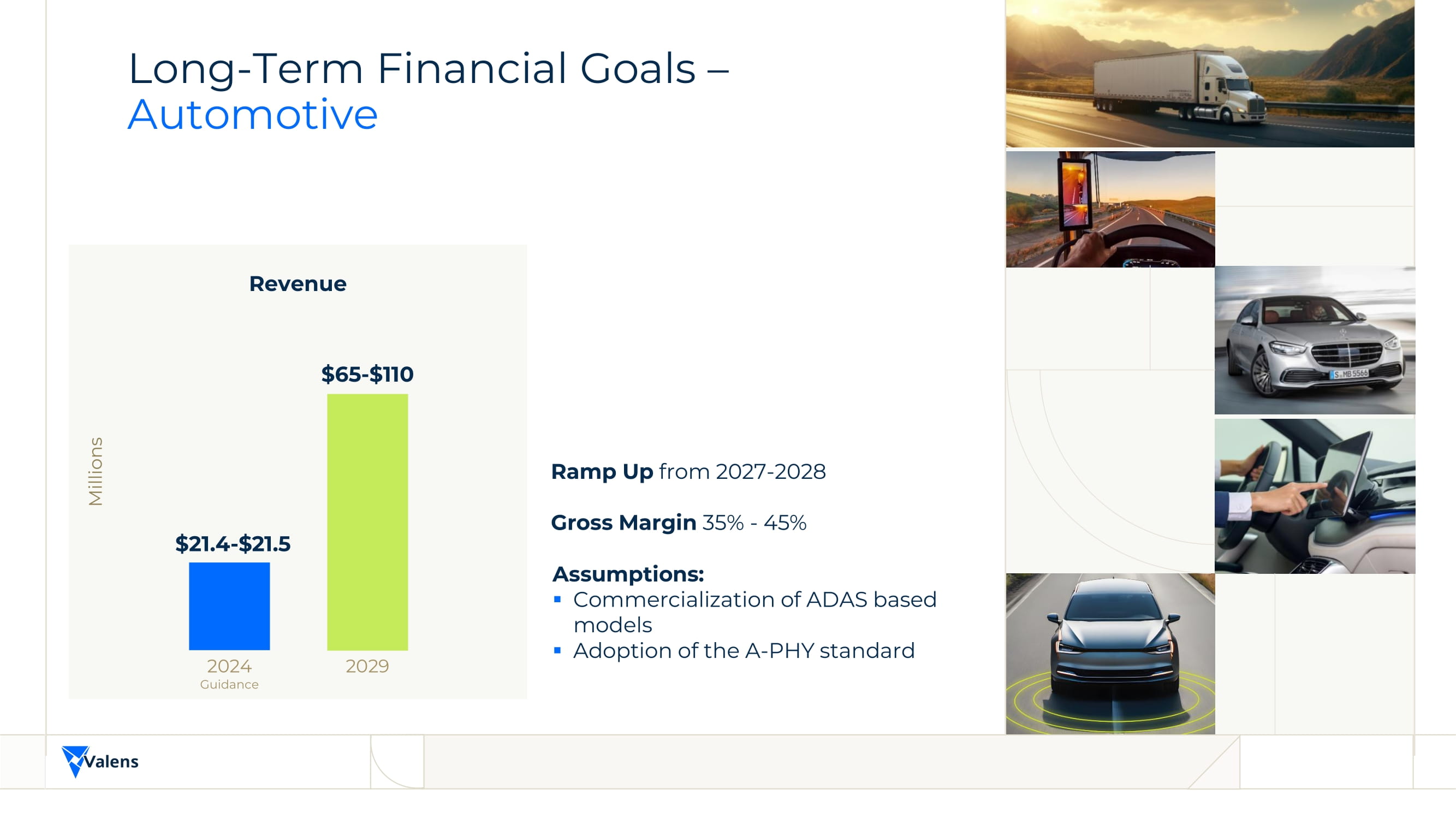 收入百万长期财务目标–汽车$ 21.4-$ 21.5 $ 65-$ 1102024指导2029从2027-2028年毛利率提升35%-45%假设:▪基于ADAS模型的商业化▪采用A-PHY标准