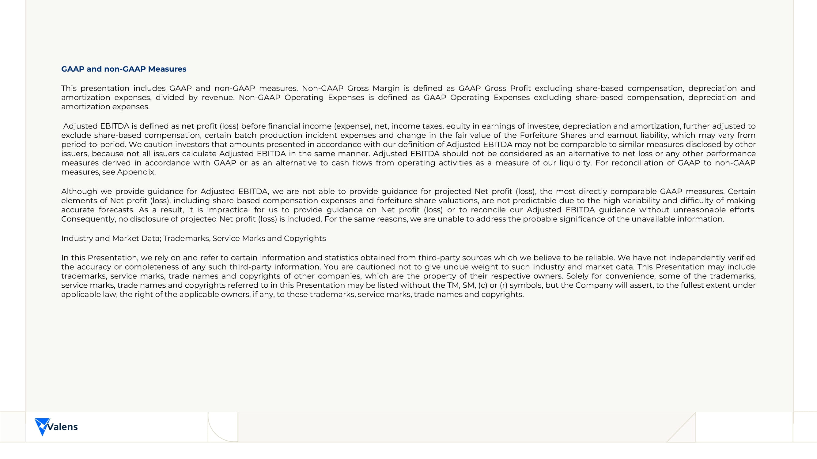 GAAP和非GAAP衡量标准本演示文稿包括GAAP和非GAAP衡量标准。Non-GAAP毛利率定义为GAAP毛利润,不包括基于股份的薪酬、折旧和摊销费用,除以收入。非GAAP运营费用定义为不包括基于股份的薪酬、折旧和摊销费用的GAAP运营费用。经调整EBITDA定义为扣除财务收入(费用)、净额、所得税、被投资方收益中的权益、折旧和摊销前的净利润(亏损),进一步调整以排除基于股份的补偿、某些批量生产事故费用以及没收股份和盈利负债的公允价值变动,这些变动可能会因期间而异。我们提醒投资者,根据我们对调整后EBITDA的定义列报的金额可能无法与其他发行人披露的类似衡量标准进行比较,因为并非所有发行人都以相同方式计算调整后EBITDA。调整后的EBITDA不应被视为净亏损或根据公认会计原则得出的任何其他业绩衡量标准的替代方案,或作为衡量我们流动性的经营活动现金流量的替代方案。有关GAAP与非GAAP措施的对账,请参见附录。尽管我们提供了调整后EBITDA的指引,但我们无法提供预测净利润(亏损)的指引,这是最直接可比的GAAP衡量标准。净利润(亏损)的某些要素,包括基于股份的补偿费用和没收股份估值,由于高度可变性和难以做出准确预测,是无法预测的。因此,我们在没有不合理努力的情况下提供净利润(亏损)指引或调节我们的调整后EBITDA指引是不切实际的。因此,没有披露预计净利润(亏损)。出于同样的原因,我们无法解决无法获得的信息的可能意义。行业和市场数据;商标、服务标志和版权在本次演示中,我们依赖并参考从第三方来源获得的我们认为可靠的某些信息和统计数据。我们未对任何此类第三方信息的准确性或完整性进行独立验证。请注意,不要对这类行业和市场数据给予过度的权重。本演示文稿可能包括其他公司的商标、服务标记、商号和版权,这些是其各自所有者的财产。仅为方便起见,本演示文稿中提及的部分商标、服务标记、商号和版权可能会在没有TM、SM、(c)或(r)符号的情况下列出,但公司将根据适用法律在最大程度上主张适用的所有者(如果有的话)对这些商标、服务标记、商号和版权的权利。