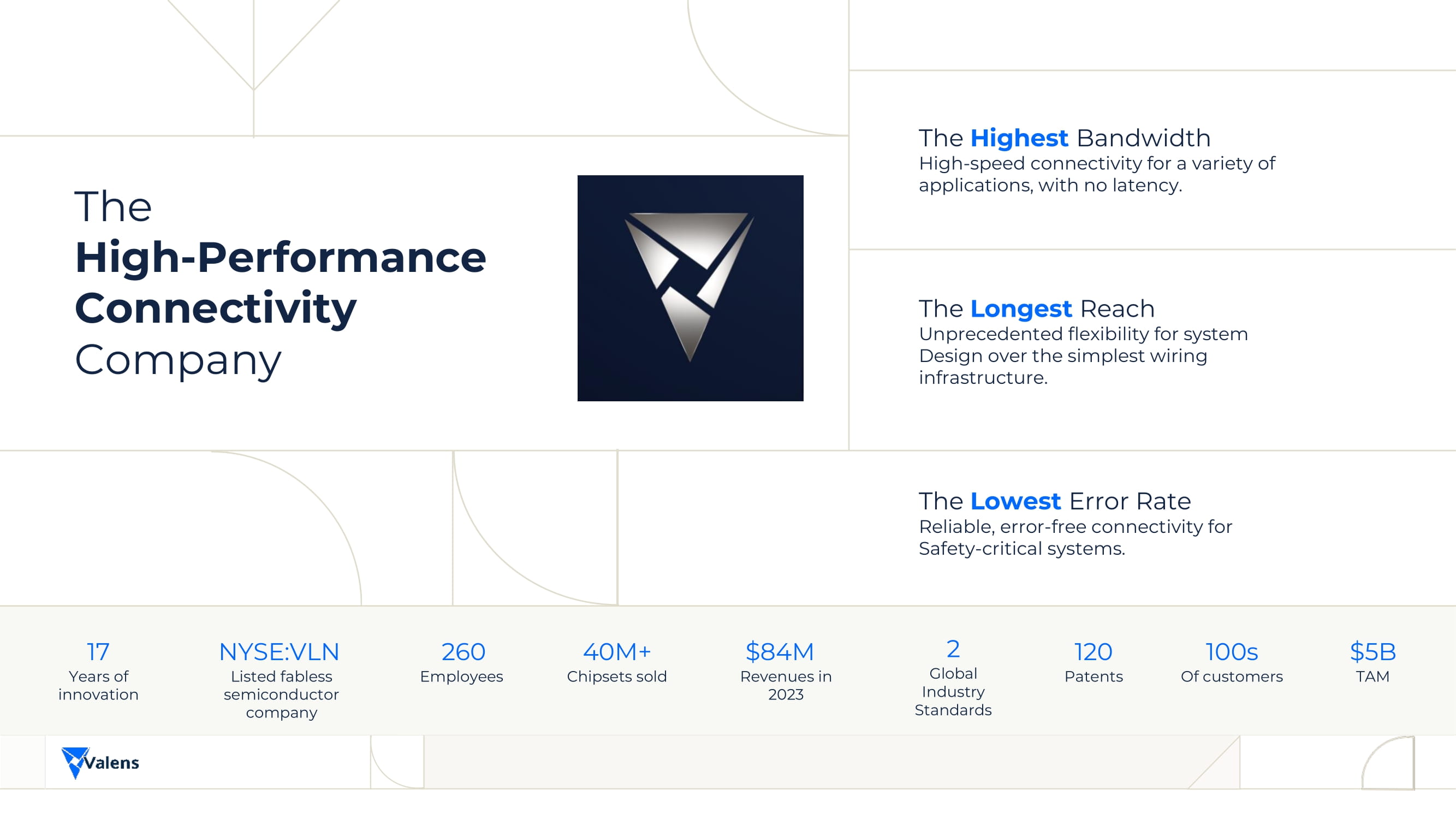 高性能连接公司最高带宽高速连接多种应用,无延时。最低的错误率可靠,安全关键系统的无错误连接。比起最简单的布线基础设施,系统设计的灵活性达到了前所未有的最长。创新半导体公司2023行业标准$ 5B 100s 1202 $ 8400万+ 260 NYSE:VLN 17 TAM的客户专利全球芯片组收入出售员工上市无晶圆厂年