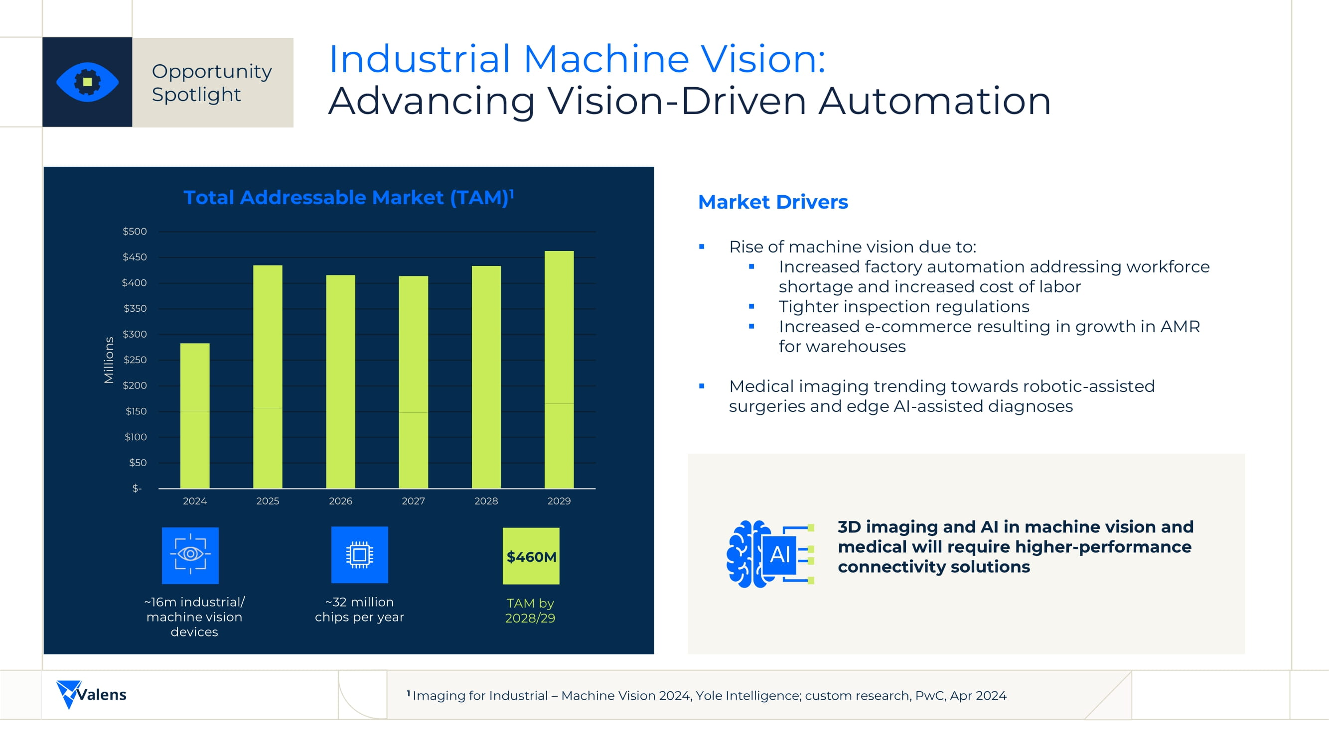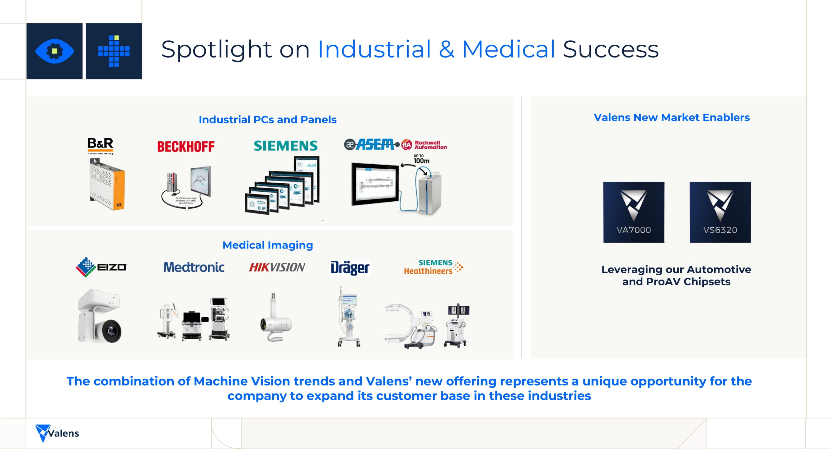 机器视觉趋势和Valens的新产品相结合,代表了该公司扩大这些行业客户群的独特机会聚焦工业和医疗成功Valens利用我们的汽车和ProAV芯片组工业PC和面板医疗成像的新市场推动者