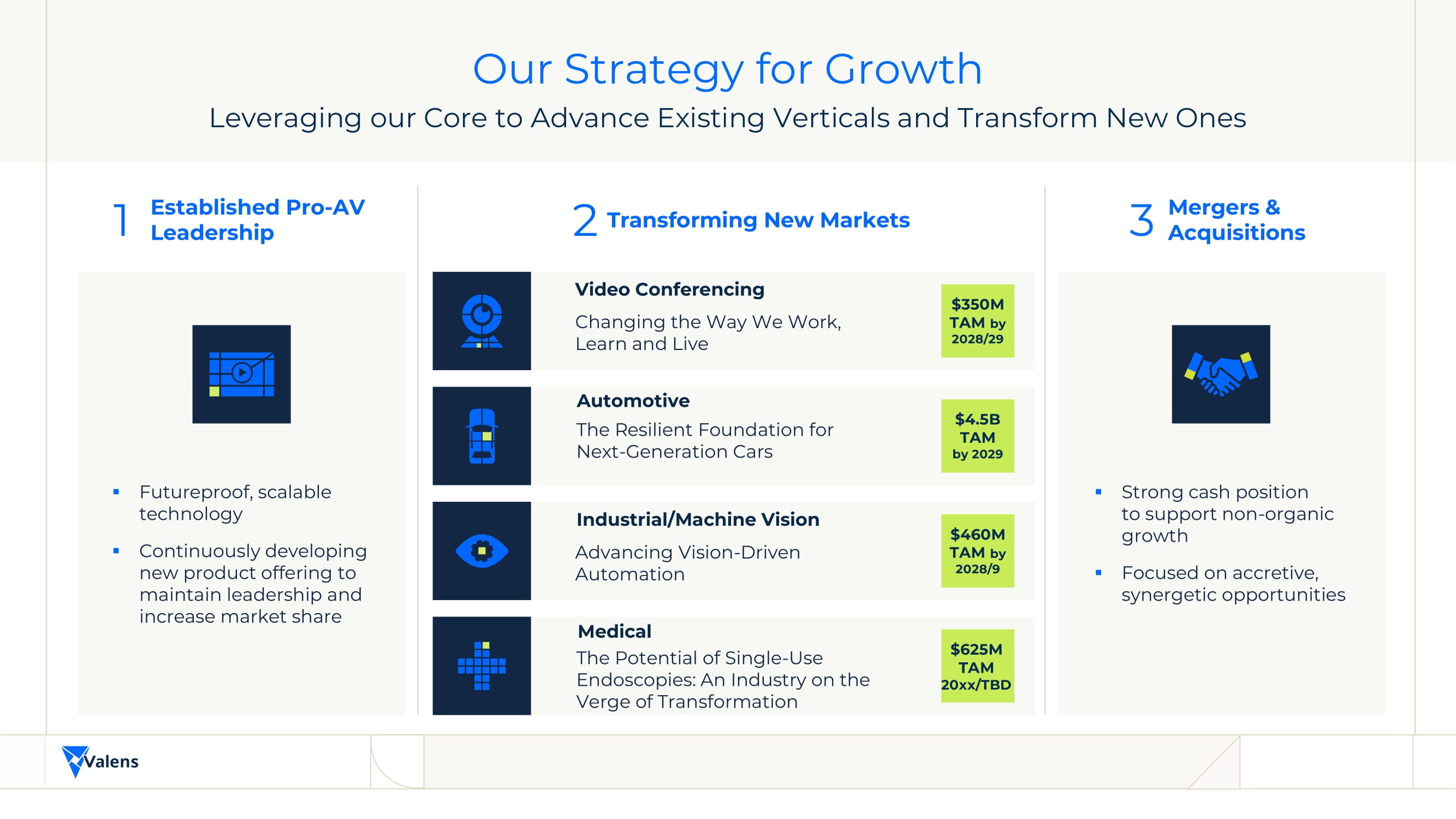 我们的增长战略利用我们的核心推进现有垂直领域并转型新的领域视频会议汽车工业/机器视觉医疗确立了Pro-AV领导地位12转型新市场并购3▪面向未来、可扩展的技术▪不断开发新产品供应保持领先并提高市场份额▪强劲的现金状况支持非有机增长▪专注于增值、协同机会2028/29年前3.5亿美元TAM 2029年前4.5b美元TAM 2028/9年前4.6亿美元TAM改变我们工作方式的6.25亿美元TAM 20xx/TBD视频会议,学活汽车下一代汽车的韧性基础工业/机器视觉推进视觉驱动自动化医疗一次性内窥镜的潜力:转型边缘的行业