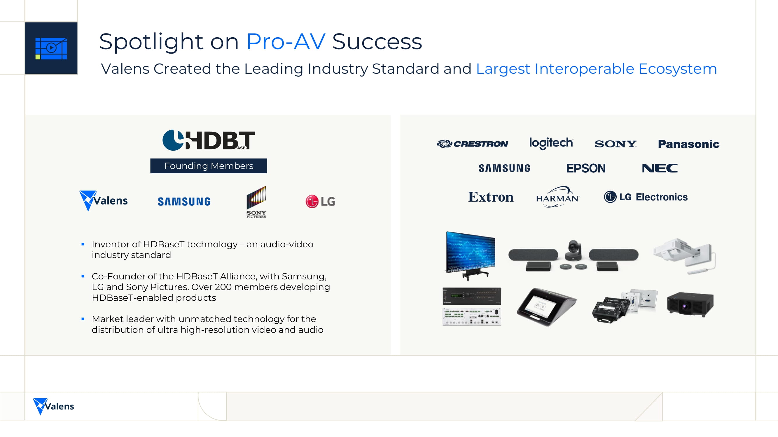 ▪HDBaseT技术发明者–音视频行业标准▪联合-HDBaseT联盟创始人,与三星、LG和索尼影业合作。超200名成员开发支持HDBaseT的产品▪拥有无与伦比技术的市场领导者为超高分辨率视频和音频发行创始成员聚焦Pro-AV成功Valens创造了领先的行业标准和最大的可互操作生态系统