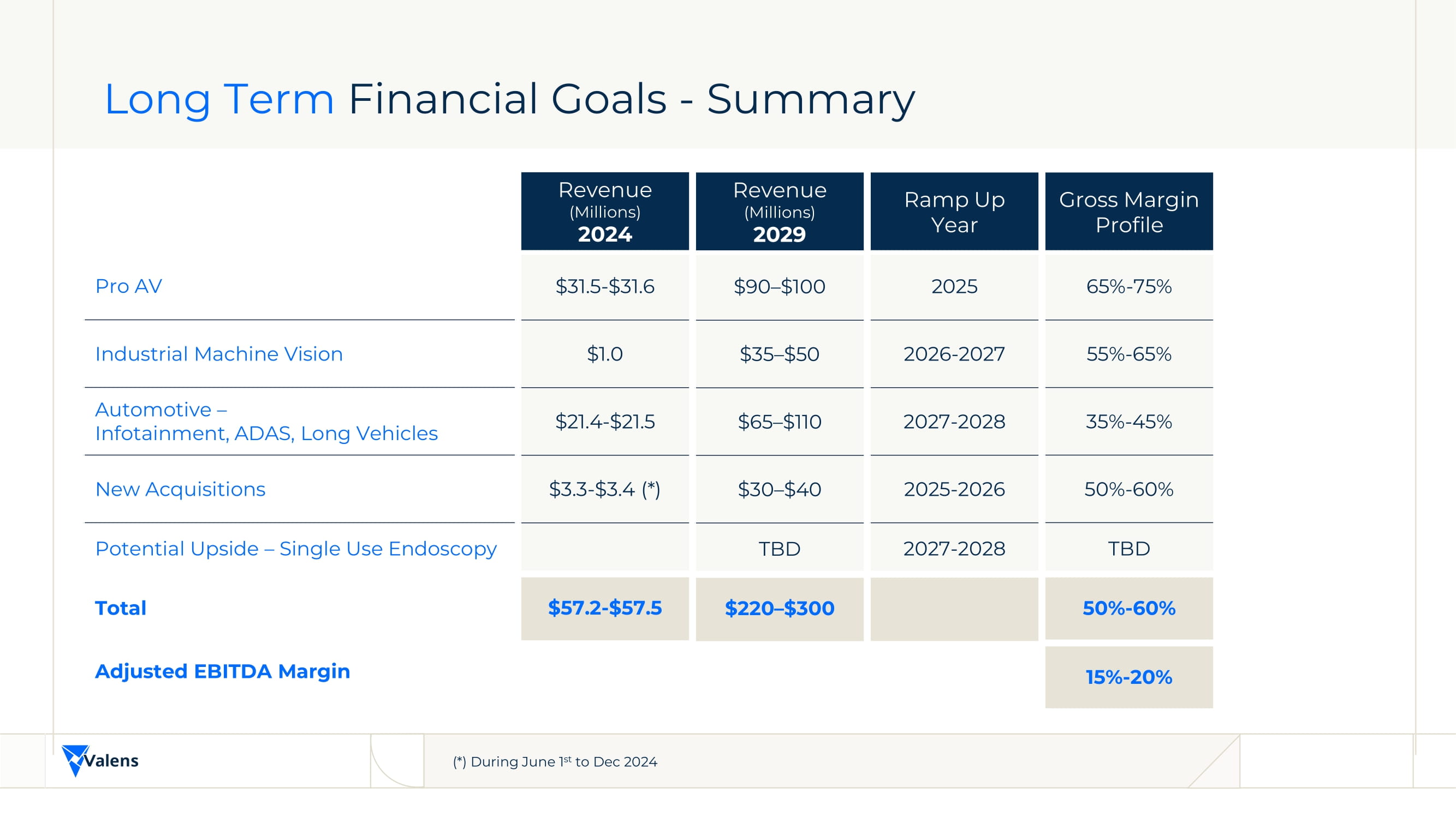 长期财务目标-摘要(*)2024年6月1日至12月期间毛利率概况上升年份收入(百万)2029年收入(百万)2024 Pro AV 65%-75% 2025 $ 90 – $ 100 $ 31.5-$ 31.655%-65% 2026-2027 $ 35 – $ 50 $ 1.0 Industrial Machine Vision 35%-45% 2027-2028 $ 65 – $ 110 $ 21.4-$ 21.5 Automotive – Infotainment,ADAS,长材50%-60% 2025-2026年$ 30 – $ 40 $ 3.3-$ 3.4(*)新收购待定2027-2028年待定潜在上行空间–一次性使用内窥镜50%-60 % $ 220 – $ 300 $ 57.2-$ 57.5总计15%-20%调整后EBITDA利润率