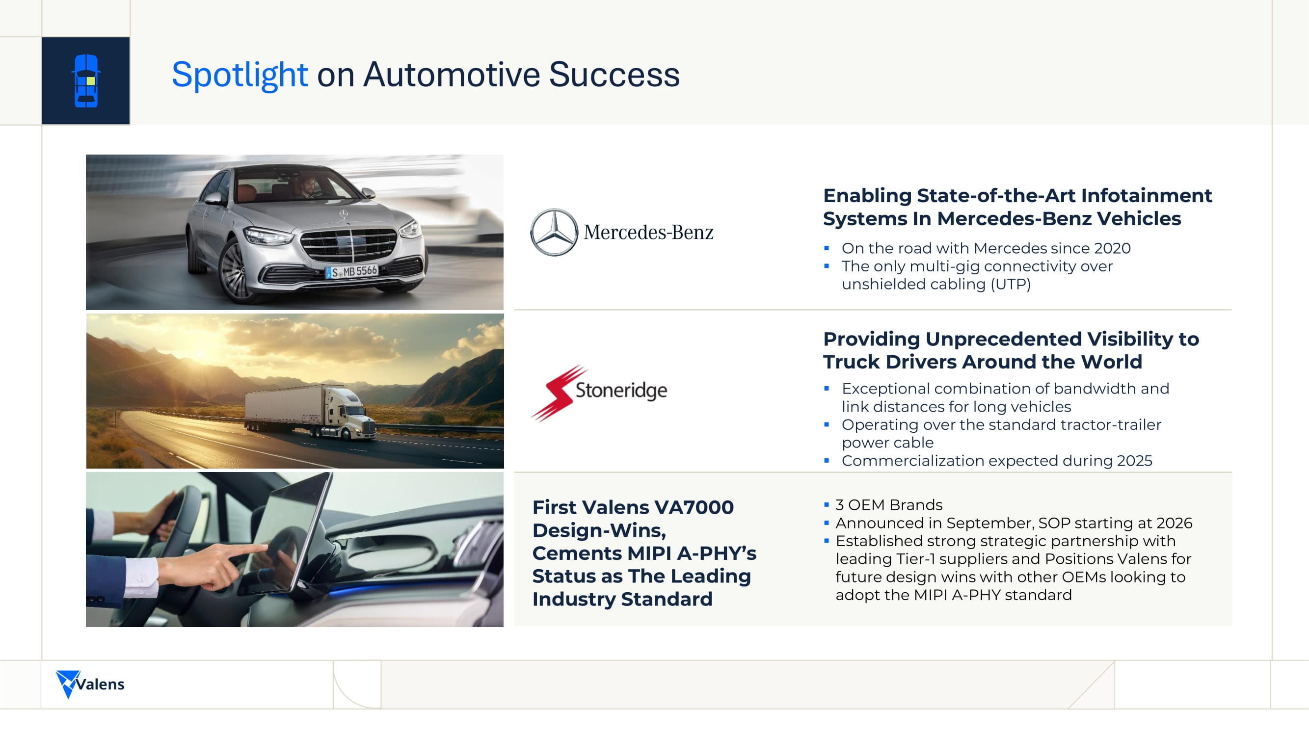 聚焦梅赛德斯-奔驰汽车中的汽车成功使能状态--艺术信息娱乐系统▪自2020年以来与梅赛德斯一起上路▪唯一通过非屏蔽布线(UTP)的多GIG连接,为世界各地的卡车司机提供前所未有的可见性▪长途车辆带宽和链路距离的特殊组合▪超标准牵引车作业-拖车电力电缆▪预计2025年实现商业化▪3个OEM品牌▪9月宣布,SOP从2026年开始▪与领先的Tier-1供应商建立了强大的战略合作伙伴关系,并将Valens定位于未来设计赢得与其他希望采用MIPI A-PHY标准的主机厂First Valens VA7000 Design-Wins,巩固MIPI A-PHY作为领先行业标准的地位