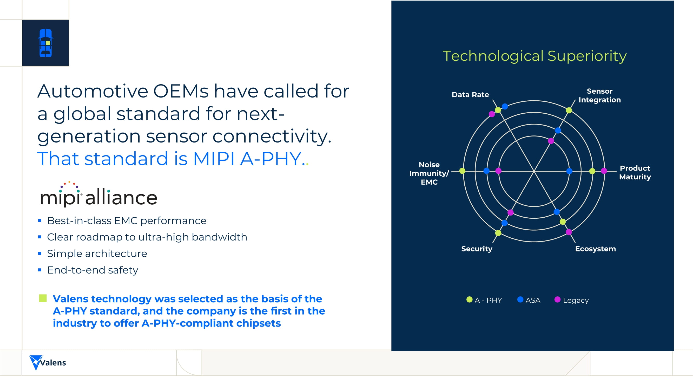汽车主机厂呼吁制定下一代传感器连接的全球标准。那个标准就是MIPI A-PHY。。▪同类最佳EMC性能▪通往超高带宽的明确路线图▪简单的建筑▪端到端安全Valens技术入选A-PHY标准基础,公司在行业内率先提供符合A-PHY标准的芯片组产品成熟度传感器集成数据速率噪声免疫/EMC安全生态系统技术优势A-PHY Legacy ASA