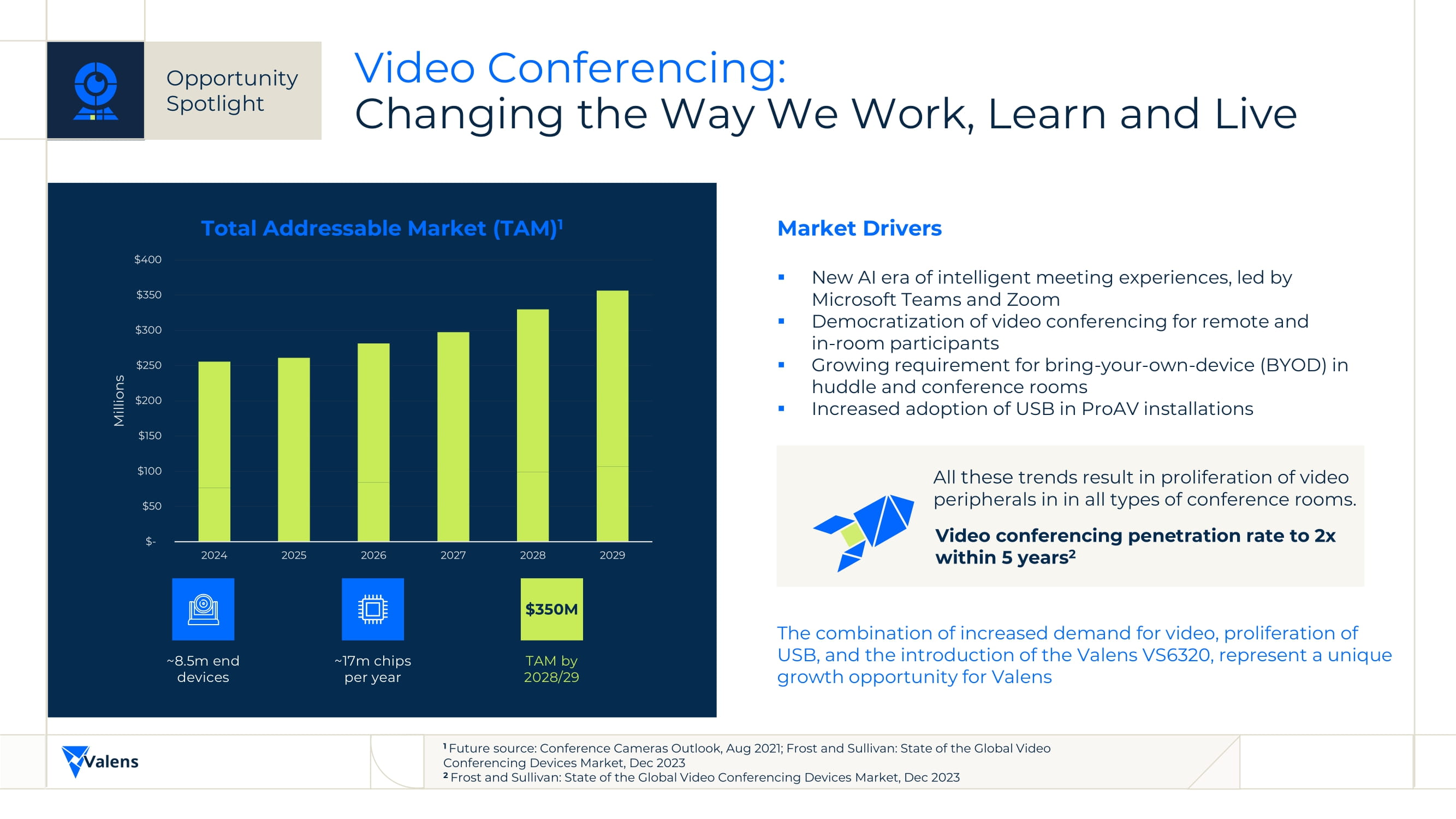市场驱动因素▪智能会议体验的AI新时代,微软Teams和Zoom引领▪远程和室内参与者视频会议民主化▪在huddle和会议室中对自带-自带-设备(BYOD)的要求不断增长▪USB在ProAV装置中的采用率增加1未来来源:会议摄像机展望,2021年8月;Frost and Sullivan:全球视频会议设备市场状况,2023年12月2 Frost and Sullivan:全球视频会议设备市场状况,2023年12月视频需求增加,USB激增,以及Valens VS6320的推出,代表了Valens视频会议的独特增长机会:改变我们工作、学习和生活的方式机会聚焦$-$ 50 $ 100 $ 150 $ 200 $ 250 $ 300 $ 350 $ 400202420252026202720282029百万TAM到2028/29 $ 3.5亿~850万终端设备~每年1700万芯片总可寻址市场(TAM)1所有这些趋势导致所有类型会议室中的视频外围设备激增。视频会议渗透率5年内提升至2倍2