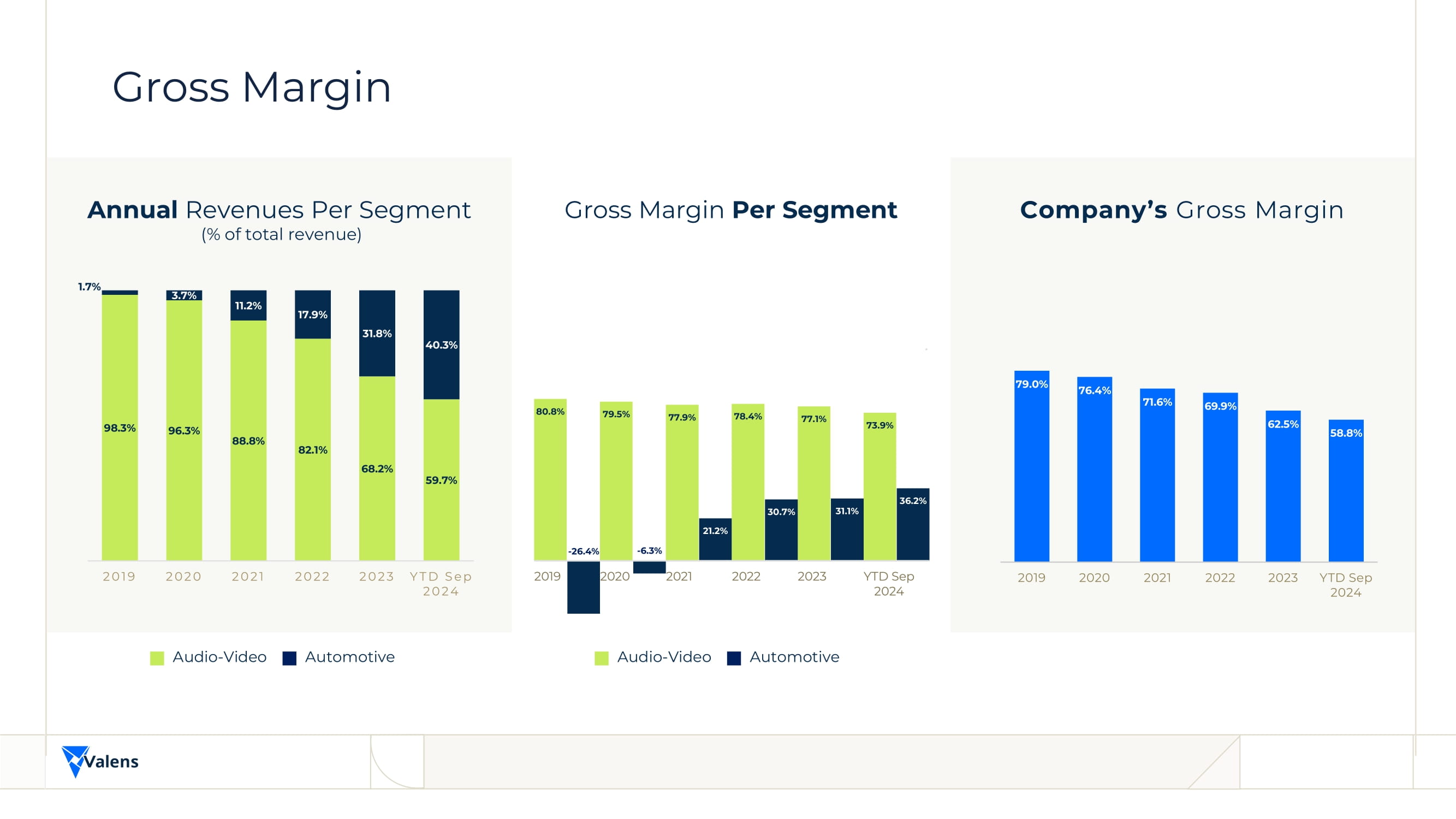 79.0% 76.4% 71.6% 69.9% 62.5% 58.8% 20192020202120222023 YTD Sep2024 80.8% 79.5% 77.9% 78.4% 77.1% 73.9%-26.4%-6.3% 21.2% 30.7% 31.1% 36.2% 20192020202120222023 YTD Sep2024 Gross Margin per Segment Company’s Gross Margin Annual Revenues per Segment(% of Total Revenue)98.3% 96.3% 88.8% 82.1% 68.2% 59.7% 1.7% 3.7% 11.2% 17.9% 31.8% 40.3% 201920202120222023 Y TD Sep2 024 Audio-Video Automotive Audio-Video Automotive