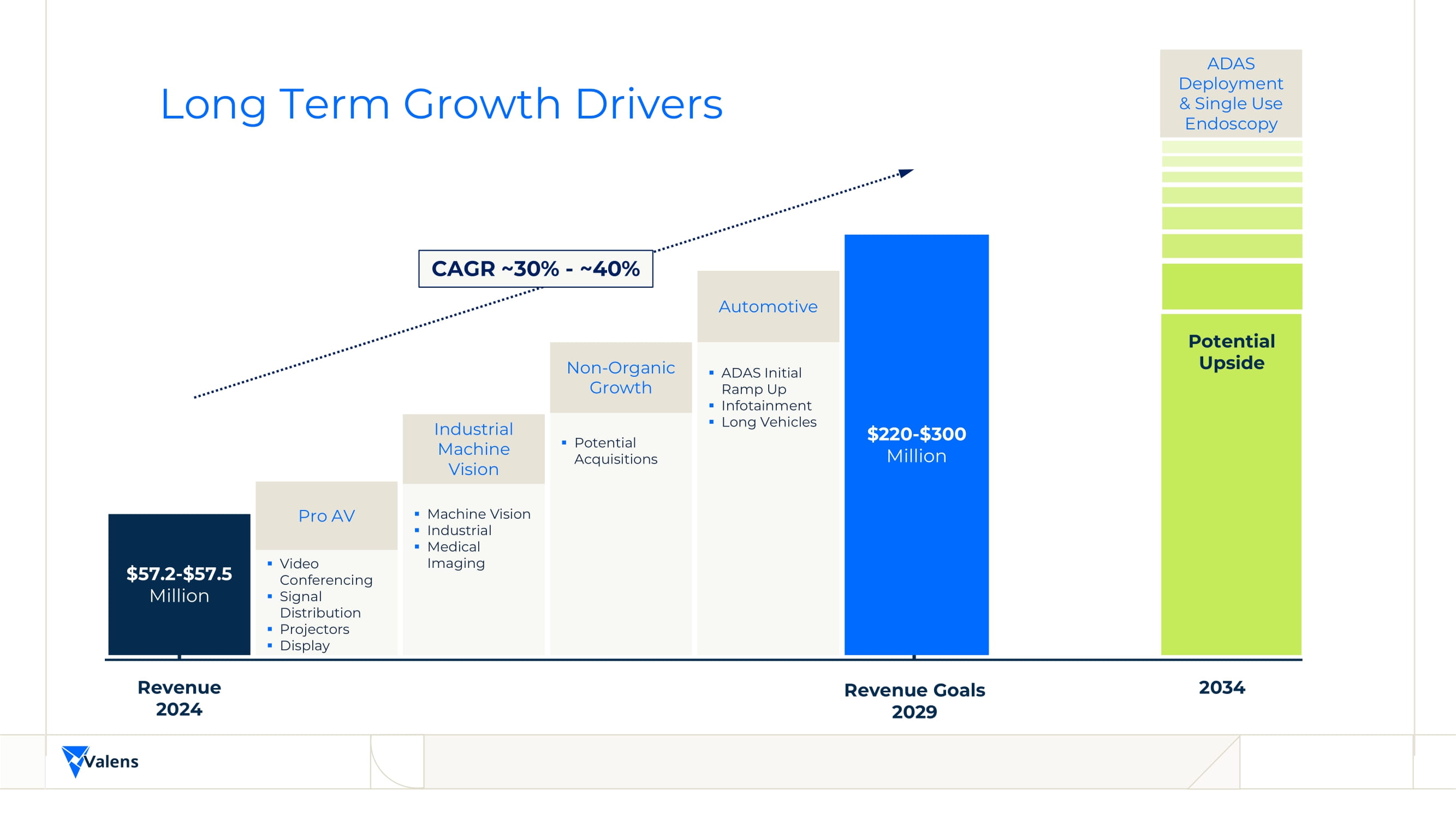 长期增长动力▪视频会议▪信号分布▪投影仪▪Display Pro AV▪机器视觉▪工业▪医学影像工业机器视觉▪ADAS初始加速▪信息娱乐▪Long Vehicles Automotive $ 57.2-$ 5750万营收2024 $ 220-$ 3亿营收目标2029▪潜在收购非有机增长ADAS部署&一次性内窥镜潜在上行空间CAGR~30%-~40% 2034