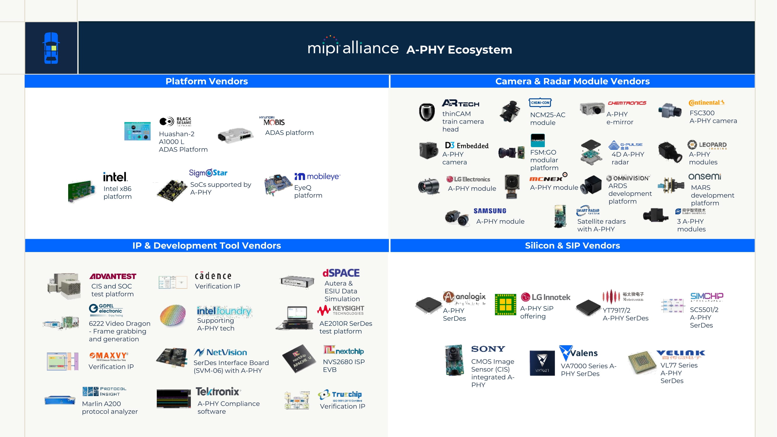 A-PHY生态系统IP &开发工具供应商华山-2个A1000 L ADAS平台EYEQ平台支持的英特尔 x86平台SoC-PHY ADAS平台相机和雷达模块供应商Silicon & SIP供应商验证IP AE2010R Serdes测试平台验证IP支持A-PHY技术Marlin A200协议分析仪验证IP CIS和SOC测试平台Autera & ESIU数据模拟A-PHY合规软件NVS2680 ISP EVB Serdes接口板(SVM-06)与A-PHY 6222视频龙-帧抓取和第A-PHY SIP提供VL77系列A-PHY Serdes SC5501/2 A-PHY Serdes VA7000系列A-PHY Serdes YT7917/2 A-PHY Serdes A-PHY Serdes CMOS图像传感器(CIS)将A-PHY卫星雷达与A-PHY 3 A-PHY模块A-PHY模块FSC300 A-PHY相机A-PHY e-mirror 4D A-PHY雷达A-PHY模块A-PHY模块A-PHY模块FSM:GO模块化平台MARS开发平台THINCAM列车摄像头头NCM25-AC模块A-PHY模块ARDS开发A平台-PHY相机平台供应商