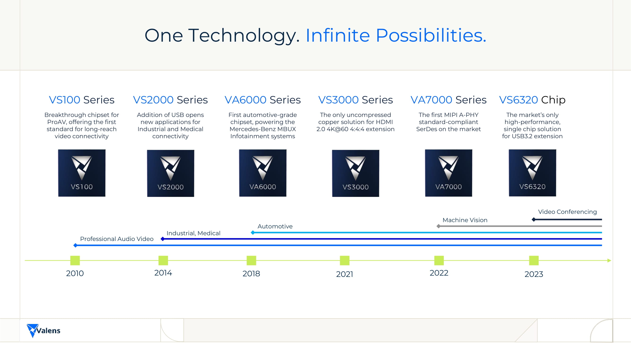 一科技。无限可能。VS3000系列HDMI 2.0 4K唯一未压缩铜解决方案@604:4:4扩展VS2000系列增加USB开启工业和医疗连接新应用VS6320芯片市场唯一高性能、单芯片解决方案USB3.2扩展VS100系列用于ProAV的突破性芯片组,提供首个远距离视频连接标准VA6000系列首个汽车级芯片组,为梅赛德斯-奔驰MBUX信息娱乐系统VA7000系列首个上市的符合MIPI A-PHY标准的SerDes提供动力20142010201820212023汽车机器视觉工业,医疗专业音视频2022视频会议