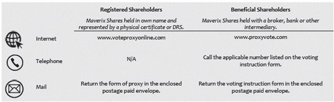 有关如何在会议上投票的详情,请参阅下表和通告中“虚拟会议投票”一节。Maverix公司强烈鼓励Maverix公司股东使用通函中所述的代理或投票指示表格提前投票,并以虚拟方式参加会议。