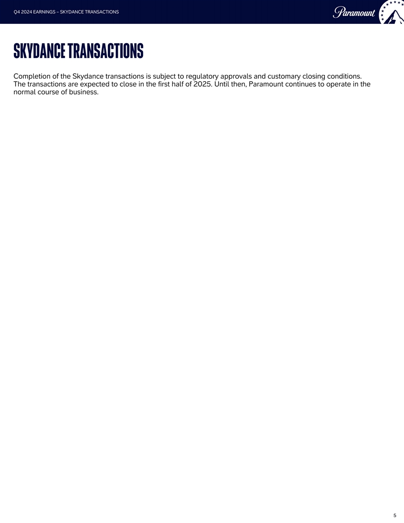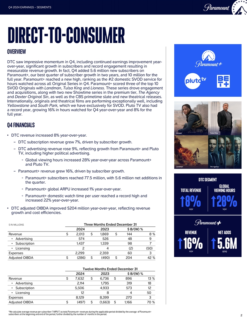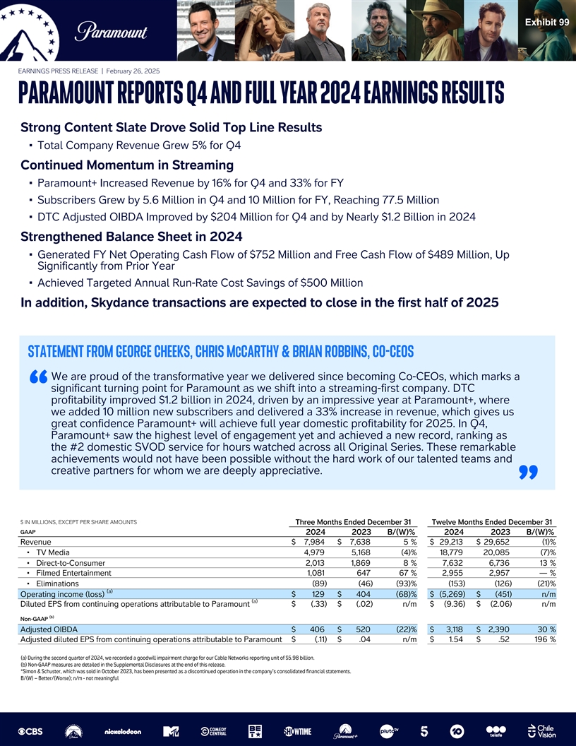 附件 99收益新闻稿| 2025年2月26日ParamOUNT报告第四季度和2024年全年收益结果强劲的内容板岩推动了稳健的顶线业绩▪Q4公司总收入增长5%流媒体持续增长势头▪派拉蒙+ Q4营收增长16%,FY增长33% – [ PLUTO:达成▪订阅用户Q4增长560万,FY增长1000万,达到7750万月近0m▪DTC调整后OIBDA第四季度增加2.04亿美元,2024年全球活跃用户(MAU)增加近12亿美元】2024年资产负债表得到加强– Affiliate &▪产生FY净经营现金流7.52亿美元和自由现金流4.89亿美元,订阅收入较上年大幅增长(1)%,其中包括DTC增长▪实现了5亿美元订阅收入的目标年度运行率成本节约,此外,Skydance交易预计将在2025年上半年完成–影院收入增长n/m –广告收入下降1%,GEORGE CHEEKS、Chris MCCARTHY和Brian Robbins的声明,共同首席执行官反映宏观经济我们为我们成为共同首席执行官以来所实现的变革年感到自豪,这标志着逆风]随着我们转向流媒体优先的公司,派拉蒙的重大转折点。2024年,DTC盈利能力提高了12亿美元,这得益于派拉蒙+令人印象深刻的一年,我们在那里增加了1000万新用户,收入增长了33%,这给了我们——订阅收入派拉蒙+在2025年实现全年国内盈利的巨大信心。第四季度,同比增长7% ——派拉蒙+的参与度达到了迄今为止的最高水平,并创下了新纪录,在所有原创剧集的观看小时数中排名国内第二的SVOD服务。这些非凡的–电影娱乐成就,如果没有我们才华横溢的团队的辛勤工作,收入增长67%的创意合作伙伴是不可能的,我们对此深表感谢。同比–影院收入同比增长n/m,在以百万为单位的盒子引领下,每股金额除外截至12月31日的三个月截至12月31日的十二个月办公室成功的微笑GAAP 20242023 B/(W)% 20242023 B/(W)%收入$ 7,984 $ 7,6385% $ 29,213 $ 29,652(1)% [派拉蒙继续展示其全球多平台战略的成功,与▪TV Media 4,9795,168(4)% 18,77920,085(7)%热门内容为核心。这一点在派拉蒙+的增长中表现得最为明显,▪直接面向消费者的2,0131,8698% 7,6326,73613%在《壮志凌云》等热门内容的推动下,第四季度新增了创纪录的990万订阅用户:▪Filmed Entertainment 1,08164767% 2,9552,957—% Maverick,1923 and Criminal Minds:Evolution。2022年,派拉蒙影业有第二个▪淘汰(89)(46)(93)%(153)(126)(21)%行业最高点击率,其8部电影中有6部在美国票房排名第一,CBS(a)营业收入(亏损)$ 129 $ 404(68)% $(5,269)$(451)n/m(a)继续保持14年的连续排名第一的广播网络,派拉蒙重新获得来自持续经营业务的稀释每股收益$(.33)$(.02)n/m $(9.36)$(2.06)n/m线性电视中最受关注的媒体家族。我们的内容和平台战略正在发挥作用(b)非公认会计原则,随着今年将有更多非凡的内容,我们预计公司将在2024年恢复调整后的OIBDA 406美元520美元(22)% 3,118美元2,39030%的盈利增长。]调整后的持续经营摊薄每股收益归属于派拉蒙美元.11)$.04 n/m $ 1.54 $.52 196%(a)在2024年第二季度,我们为有线电视网络报告单位记录了59.8亿美元的商誉减值费用。(b)非公认会计原则措施详见本新闻稿末尾的补充披露。*于2023年10月出售的Simon & Schuster已在公司合并财务报表中作为已终止经营业务列报。B/(W)– better/(worse);n/m-无意义