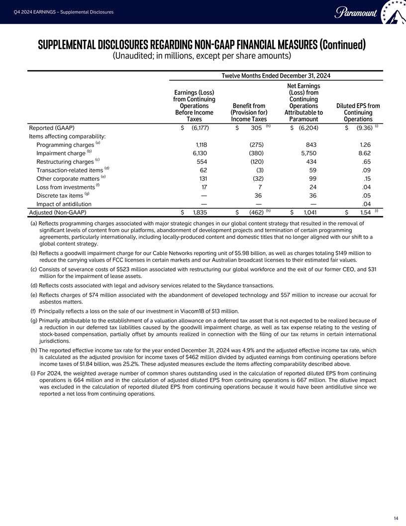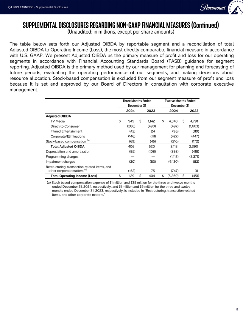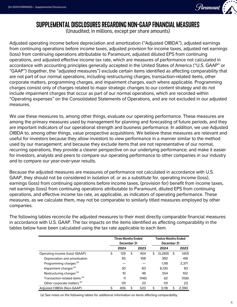 2024年第四季度收益–补充披露补充披露关于非公认会计原则财务措施(未经审计;以百万计,每股金额除外)的调整后折旧和摊销前营业收入(“调整后的OIBDA”)、调整后的所得税前持续经营收益、调整后的所得税拨备、调整后的归属于派拉蒙的持续经营净收益(亏损)、调整后的持续经营摊薄每股收益和调整后的有效所得税率,这些是未按照美国普遍接受的会计原则计算的业绩衡量标准(“美国公认会计原则”或“公认会计原则”)(合,“调整后的措施”)不包括被确定为影响可比性但不属于我们正常运营的某些项目,包括重组费用、交易相关项目、其他公司事项、编程费用和减值费用,每一项都在适用的情况下。编程费用仅包括与我们的内容战略的重大战略变化相关的费用,不包括作为我们正常运营的一部分而发生的减值费用,这些费用记录在综合运营报表的“运营费用”中,并且不排除在我们调整后的措施中。我们使用这些措施,除其他外,评估我们的经营业绩。这些措施是管理层用于规划和预测未来期间的主要措施之一,它们是FBI衡量我们运营实力和业务绩效的重要指标。此外,除其他外,我们使用调整后的OIBDA来评估潜在收购。我们认为,这些措施对投资者来说是相关和有用的,因为它们允许投资者以类似于我们管理层使用的方法的方式看待业绩;并且由于它们排除了不代表我们正常的经常性业务的项目,它们提供了对我们基本业绩的更清晰的视角;并使投资者、分析师和同行更容易将我们的经营业绩与我们行业内的其他公司进行比较,并比较我们的同比业绩。由于调整后的衡量标准是不按照美国公认会计原则计算的业绩衡量标准,因此不应将营业收入(亏损)、所得税前持续经营业务的收益(亏损)、所得税(拨备)收益、归属于派拉蒙的持续经营业务的净收益(亏损)、持续经营业务的稀释每股收益和有效所得税率(如适用)作为经营业绩的指标孤立地考虑或作为替代。这些措施,正如我们计算的那样,可能无法与其他公司采用的类似标题的措施相提并论。截至9月30日的三个月,单位:百万美元下表根据美国公认会计原则将调整后的计量与其最直接可比的财务计量20222021 $ B/(W)%进行了核对。对以下收入$ 4,948 $ 5,220 $(272)(5)%表中确定的影响可比性的项目的税收影响是使用适用于每个项目的税率计算的。▪广告1,9732,039(66)(3)▪附属及认购2,0002,108(108)(5)三个月结束十二个月结束▪许可及其他9751,073(98)(9)12月31日12月31日费用3,7173,83511832024202320242023调整后OIBDA $ 1,231 $ 1,385 $(154)(11)%营业收入(亏损)(GAAP)$ 129 $ 404 $(5,269)$(451)折旧及摊销95108392418截至9月30日止九个月$百万(a)编程费用—— 1,1182,37120222021 $ B/(W)%(a)减值费用30836,13083收入$ 15,849 $ 16,432 $(583)(4)%(a)重组费用1048554102▪广告6,6687,230(562)(8)(a)交易相关项目11(146)62(156)▪关联及认购6,1566,303(147)(2)(a)其他公司事项1312313123▪许可和其他3,0252,8991264调整后OIBDA(Non-GAAP)$ 406 $ 520 $ 3,118 $ 2,390费用11,69411,778841调整后OIBDA $ 4,155 $ 4,654 $(499)(11)%(a)有关影响可比性的项目的更多信息,请参见下表附注。11