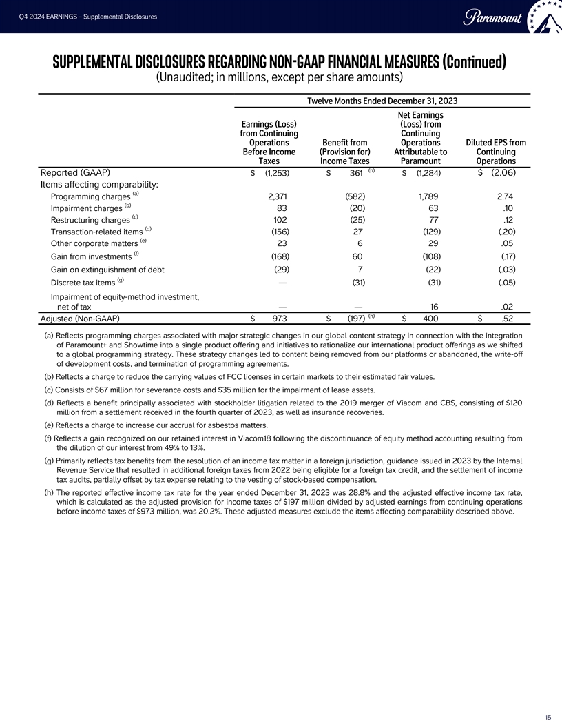 2024年第四季度收益–补充披露关于非公认会计原则财务措施的补充披露(续)(未经审计;以百万计,每股金额除外)截至12月31日的十二个月,2024持续持续经营业务净收益收益(亏损)(亏损)经营业务收益持续税前收益(拨备)摊薄EPS派拉蒙经营(h)(i)报告(GAAP)$(6,177)$ 305 $(6,204)$(9.36)影响可比性的项目:(a)编程费用1,118(275)8431.26(b)减值费用6,130(380)5,7508.62(c)重组费用554(120)434.65(d)与交易相关的项目62(3)59.09(e)其他公司事项131(32)99.15(f)投资损失17724.04(g)离散税项— 3636.05反稀释的影响———.04(h)(i)调整后(Non-GAAP)1,835美元(462)1,041美元1.54美元FBI(a)反映了与我们全球内容战略的重大战略变化相关的节目费用,这些变化导致从我们的平台上删除大量内容、放弃开发项目和终止某些节目协议,特别是在国际上,包括不再符合我们转向全球内容战略的本地制作内容和国内标题。(b)反映了我们有线电视网络报告部门59.8亿美元的商誉减值费用,以及总计1.49亿美元的费用,用于将某些市场的FCC许可证和我们的澳大利亚广播许可证的账面价值降低至其估计的公允价值。(c)包括与重组我们的全球员工队伍和前任首席执行官离职相关的5.23亿美元的遣散费,以及3100万美元的租赁资产减值。(d)反映与Skydance交易相关的法律和咨询服务相关的费用。(e)反映了与放弃已开发技术相关的7400万美元的费用和5700万美元用于增加我们对石棉事项的应计费用。(f)主要反映出售我们在Viacom18的投资的损失为1300万美元。(g)主要是由于商誉减值费用导致我们的递延税项负债减少,预期无法实现的递延税项资产的估值备抵,以及与基于股票的补偿归属相关的税务费用,部分被与我们在某些国际司法管辖区提交纳税申报表相关的实现金额所抵消。(h)截至2024年12月31日止年度报告的实际所得税率为4.9%,经调整的实际所得税率为25.2%,其计算方法为经调整的所得税拨备4.62亿美元除以经调整的所得税前持续经营业务收益18.4亿美元。这些调整后的措施不包括上述影响可比性的项目。截至9月30日的三个月(百万美元)(i)对于2024年,用于计算来自持续的20222021 $ B/(W)%运营的报告摊薄每股收益的加权平均已发行普通股股数为6.64亿股,用于计算来自持续运营的调整后摊薄每股收益的加权平均已发行普通股股数为6.67亿股。稀释影响收入$ 4,948 $ 5,220 $(272)(5)%在计算报告的持续经营摊薄每股收益时被排除在外,因为这将是反稀释的,因为我们报告了持续经营的净亏损。▪广告1,9732,039(66)(3)▪附属及认购2,0002,108(108)(5)▪许可和其他9751,073(98)(9)费用3,7173,8351183调整后OIBDA $ 1,231 $ 1,385 $(154)(11)%截至9月30日的九个月$百万单位20222021 $ B/(W)%收入$ 15,849 $ 16,432 $(583)(4)%▪广告6,6687,230(562)(8)▪附属及认购6,1566,303(147)(2)▪许可及其他3,0252,8991264费用11,69411,778841调整后OIBDA $ 4,155 $ 4,654 $(499)(11)% 14资料来源:尼尔森媒体研究