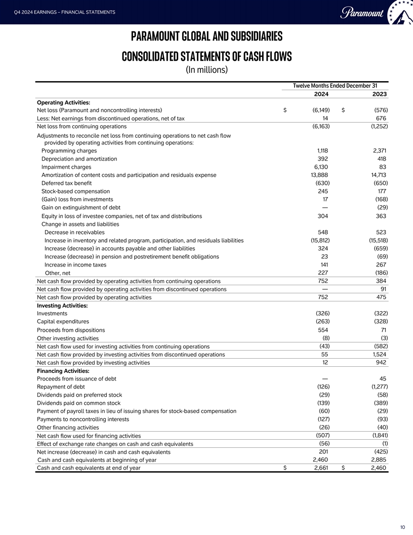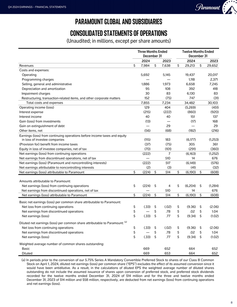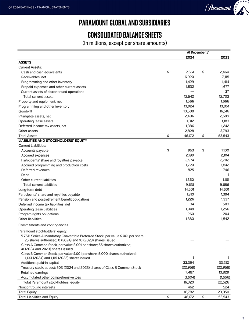 2024年第四季度收益–财务报表PARAMOUNT全球和子公司合并经营报表(未经审计;以百万计,每股金额除外)截至12月31日的三个月截至12月31日的十二个月2024202320242023收入7,984美元7,638美元29,213美元29,652美元成本和费用:经营5,6925,14519,43720,017编程费用—— 1,1182,371销售、一般和行政费用1,8861,9736,6587,245折旧和摊销95108392418减值费用30836,13083重组、交易相关项目,及其他公司事项152(75)747(31)成本费用总额7,8557,23434,48230,103营业收入(亏损)129404(5,269)(451)利息费用(215)(222)(860)(920)利息收入4040151137投资收益(亏损)(13)—(17)168债务清偿收益— 29 — 29其他项目净额(56)(68)(182)(216)所得税前持续经营收益(亏损)和被投资公司亏损中的权益(115)183(6,177)(1,253)(拨备)所得税收益(37)(75)305361被投资公司亏损中的权益,税后净额(70)(101)(291)(360)持续经营净收益(亏损)(222)7(6,163)(1,252)终止经营净收益,税后净额— 51014676净收益(亏损)(至高无上和非控股权益)(222)517(6,149)(576)归属于非控股权益的净收益(2)(3)(41)(32)归属于派拉蒙的净收益(亏损)$(224)$ 514 $(6,190)$(608)归属于派拉蒙的金额:持续经营净收益(亏损)$(224)$ 4 $(6,204)$(1,284)终止经营净收益,税后净额— 51014676归属于派拉蒙的净收益(亏损)$(224)$ 514 $(6,190)$(608)归属于派拉蒙的每股普通股基本净收益(亏损):持续经营净亏损$(.33)$(.02)$(9.36)$(2.06)终止经营净收益$ — $.78 $.02 $ 1.04净收益(亏损)$(.33)$.77 $(9.34)$(1.02)(a)归属于派拉蒙的每股普通股摊薄净收益(亏损):持续经营净亏损$(.33)$.02)$(9.36)$(2.06)终止经营净收益$ — $.78 $.02 $ 1.04净收益(亏损)$(.33)$.77 $(9.34)$(1.02)已发行普通股加权平均数:基本669652664652稀释后的669653664652(a)在2024年4月1日我们的5.75% A系列强制性可转换优先股转换为B类普通股股份之前的期间,稀释后的每股普通股净收益(亏损)(“EPS”)不包括其假设转换的影响,因为它本来是反稀释的。因此,在计算稀释每股收益时,已发行稀释股份的加权平均数不包括假设在优先股转换时发行的股份,截至2024年12月31日止十二个月的优先股股息分别为1400万美元和截至2023年12月31日止三个月和十二个月的优先股股息分别为1400万美元和5800万美元,从持续经营业务的净收益(亏损)和净收益(亏损)中扣除。8