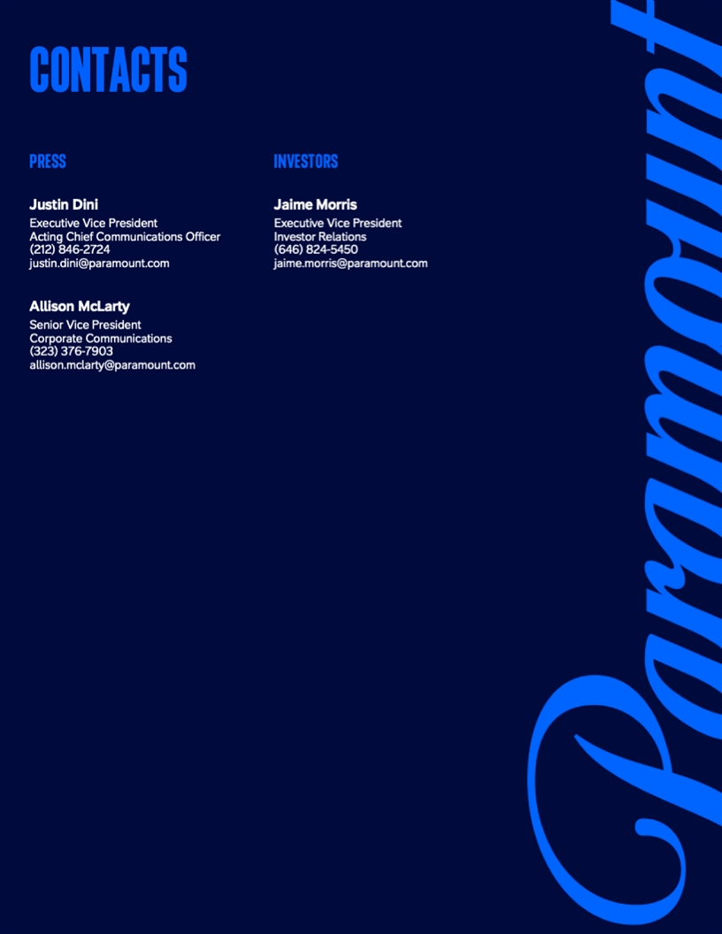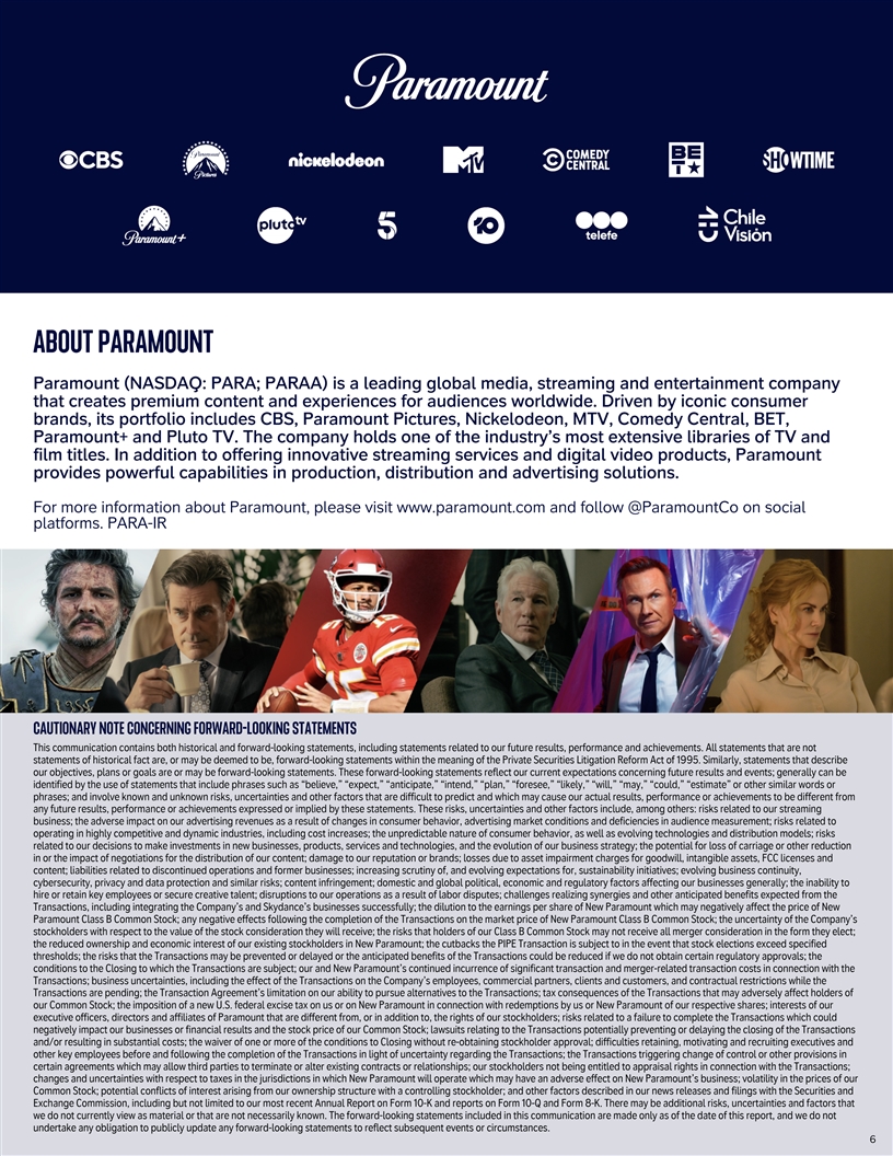 关于PARAMOUNT派拉蒙(纳斯达克股票代码:PARA;PARAA)是一家全球领先的媒体、流媒体和娱乐公司,为全球观众创造优质内容和体验。在标志性消费品牌的推动下,其产品组合包括CBS、派拉蒙影业、尼克国际儿童频道、MTV、喜剧中心、BET、派拉蒙+和Pluto TV。该公司拥有业内最广泛的电视和电影片头库之一。除了提供创新的流媒体服务和数字视频产品,派拉蒙还在制作、发行和广告解决方案方面提供了强大的能力。更多关于派拉蒙的信息,请访问www.paramount.com,并在社交平台上关注@ paramountCo。PARA-IR关于前瞻性陈述的警示性说明本通讯包含历史和前瞻性陈述,包括与我们未来的结果、业绩和成就相关的陈述。所有不是历史事实陈述的陈述都是或可能被视为1995年《私人证券诉讼改革法案》含义内的前瞻性陈述。同样,描述我们的目标、计划或目标的陈述是或可能是前瞻性陈述。这些前瞻性陈述反映了我们目前对未来结果和事件的预期;通常可以通过使用包含诸如“相信”、“预期”、“预期”、“打算”、“计划”、“预见”、“可能”、“将”、“可能”、“可能”、“估计”或其他类似词语或短语的陈述来识别;并涉及已知和未知的风险、不确定性和其他难以预测的因素,这些因素可能导致我们的实际结果、业绩或成就与这些陈述明示或暗示的任何未来结果、业绩或成就不同。这些风险、不确定性和其他因素包括(其中包括):与我们的流媒体业务相关的风险;消费者行为、广告市场状况和受众衡量缺陷的变化对我们的广告收入造成的不利影响;与在高度竞争和充满活力的行业中运营相关的风险,包括成本增加;消费者行为的不可预测性,以及不断发展的技术和分销模式;与我们对新业务、产品、服务和技术进行投资的决策相关的风险,以及我们业务战略的演变;关于分发我们的内容的潜在运输损失或其他减少或谈判的影响;对我们的声誉或品牌的损害;由于商誉、无形资产、FCC许可证和内容的资产减值费用造成的损失;与已终止的业务和以前的业务相关的负债;对可持续发展举措的日益审查和不断变化的预期;不断变化的业务连续性、网络安全、隐私和数据保护以及类似风险;内容侵权;国内和全球政治,总体上影响我们业务的经济和监管因素;无法雇用或留住关键员工或确保创造性人才;劳资纠纷导致我们的运营中断;实现协同效应的挑战以及预期从交易中获得的其他预期收益,包括成功整合公司和Skydance的业务;可能对新派拉蒙B类普通股价格产生负面影响的新派拉蒙每股收益的稀释;交易完成后对新派拉蒙B类普通股市场价格的任何负面影响;公司股东对其将获得的股票对价价值的不确定性;风险我们B类普通股的持有人可能不会以他们选择的形式收到所有合并对价;我们现有股东在新派拉蒙的所有权和经济利益减少;在股票选择超过特定阈值的情况下,PIPE交易的削减受制于;交易可能被阻止或延迟或交易的预期收益可能减少的风险如果我们未获得某些监管批准;交易须遵守的交割条件;我们和新派拉蒙继续产生与交易相关的重大交易和与合并相关的交易成本;业务不确定性,包括交易对公司员工、商业合作伙伴、客户和客户的影响, 交易待决期间的合同限制;交易协议对我们寻求交易替代方案的能力的限制;可能对我们普通股持有人产生不利影响的交易的税务后果;就我们或新派拉蒙赎回我们各自的股份而对我们或新派拉蒙征收新的美国联邦消费税;我们的执行官、董事和派拉蒙关联公司的利益不同于或除此之外,我们股东的权利;与未能完成交易相关的风险,这可能会对我们的业务或财务业绩以及我们普通股的股价产生负面影响;与交易相关的诉讼可能会阻止或延迟交易的完成和/或导致大量成本;在未重新获得股东批准的情况下放弃完成交易的一项或多项条件;难以保留,鉴于交易的不确定性,在交易完成之前和之后激励和招聘高管和其他关键员工;交易触发控制权变更或某些协议中可能允许第三方终止或改变现有合同或关系的其他条款;我们的股东无权就交易获得评估权;变更以及New Paramount将在其经营的司法管辖区的税收方面的不确定性,这可能会对New Paramount的业务产生不利影响;我们普通股价格的波动;我们与控股股东的所有权结构产生的潜在利益冲突;以及我们在新闻稿和提交给美国证券交易委员会的文件中描述的其他因素,包括但不限于我们最近的10-K表格年度报告以及10-Q和8-K表格报告。可能会有额外的风险,我们目前认为不重要或不一定知道的不确定性和因素。本通讯中包含的前瞻性陈述仅在本报告发布之日作出,我们不承担任何义务公开更新任何前瞻性陈述以反映后续事件或情况。6 6