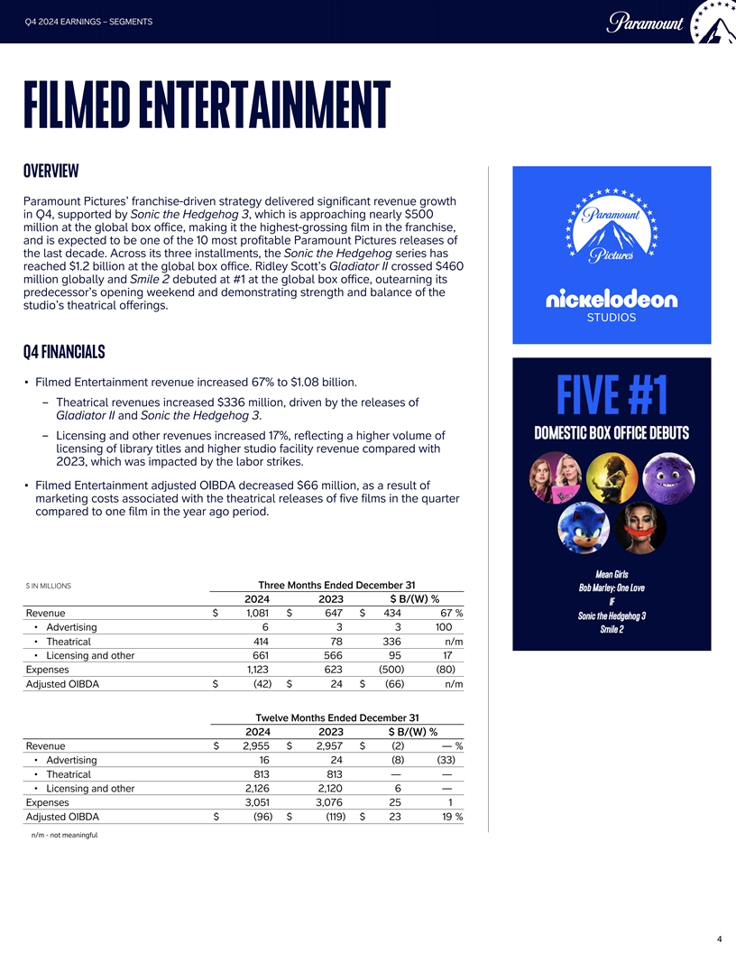 2024年第四季度收益–分部电影娱乐概览派拉蒙影业的特许经营驱动战略在《刺猬索尼克3》的支持下在第四季度实现了显着的收入增长,全球票房接近5亿美元,使其成为特许经营中票房最高的电影,预计将成为过去十年派拉蒙影业发行的10部最赚钱的电影之一。在其三部作品中,《刺猬索尼克》系列的全球票房达到了12亿美元。雷德利·斯科特的《角斗士II》全球票房突破4.6亿美元,《微笑2》首次亮相全球票房排名第一,超过了其前身的首映周末,并展示了该工作室在影院产品的实力和平衡。第四季度财务▪电影娱乐收入增长67%至10.8亿美元。–在《角斗士II》和《刺猬索尼克3》上映的推动下,影院收入增加了3.36亿美元。–授权和其他收入增长17%,反映出受劳工罢工影响,与2023年相比,图书馆书名授权数量增加,工作室设施收入增加。▪Filmed Entertainment调整后的OIBDA减少了6600万美元,原因是截至9月30日的三个月,与本季度五部电影的影院上映相关的营销成本以百万美元计,而去年同期为一部电影。20222021 $ B/(W)%收入$ 783 $ 530 $ 25348%▪广告32150▪剧场版23167164245▪许可和其他5494618819美元百万截至12月31日的三个月费用742554(188)(34)20242023 $ B/(W)%调整后OIBDA $ 41 $(24)$ 65 n/m收入$ 1,081 $ 647 $ 43467%▪广告633100截至9月30日止九个月▪剧场版41478336 n/m $百万▪许可及其他661566951720222021 $ B/(W)%费用1,123623(500)(80)收入$ 2,770 $ 1,993 $ 77739%调整后OIBDA $(42)$ 24 $(66)n/m▪广告1714321▪剧场版1,126202924457截至12月31日止十二个月▪许可及其他1,6271,777(150)(8)20242023 $ B/(W)%费用2,5851,786(799)(45)收入$ 2,955 $ 2,957 $(2)—%调整后OIBDA $ 185 $ 207 $(22)(11)%▪广告1624(8)(33)▪剧场版813813 ——▪许可和其他2,1262,1206 —费用3,0513,076251调整后OIBDA $(96)$(119)$ 2319% n/m-无意义的资产负债表和流动性▪截至2024年12月31日,该公司的资产负债表上有$ 2.5B的现金和承诺的$ 3.5B $ 2.5B $ 3.5B的循环信贷额度,但仍未提取。4 4