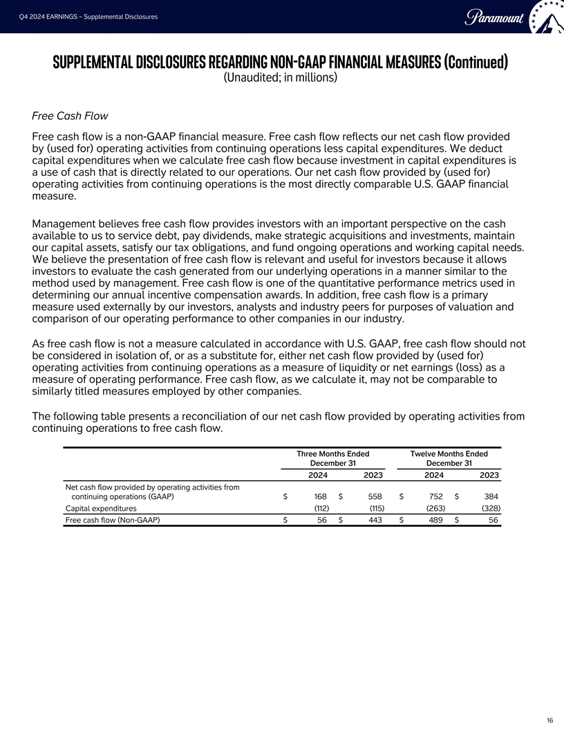 2024年第四季度收益–补充披露关于非公认会计原则财务措施的补充披露(续)(未经审计;以百万计)自由现金流自由现金流是一种非公认会计原则财务措施。自由现金流反映了我们由持续经营业务提供(用于)经营活动的净现金流减去资本支出。我们在计算自由现金流时会扣除资本支出,因为对资本支出的投资是对与我们的运营直接相关的现金的使用。我们由(用于)持续经营业务的经营活动提供的净现金流是最直接可比的美国公认会计准则财务指标。管理层认为,自由现金流为投资者提供了一个重要视角,让他们了解我们可用于偿还债务、支付股息、进行战略收购和投资、维持我们的资本资产、履行我们的纳税义务以及为持续运营和营运资金需求提供资金的现金。我们认为,自由现金流的列报对投资者来说是相关和有用的,因为它允许投资者以类似于管理层使用的方法的方式评估我们基础业务产生的现金。自由现金流是用于确定我们年度激励薪酬奖励的量化绩效指标之一。此外,自由现金流是我们的投资者、分析师和行业同行外部使用的主要FBI衡量标准,用于对我们的经营业绩进行估值并与我们行业的其他公司进行比较。由于自由现金流不是按照美国公认会计原则计算的衡量标准,因此,自由现金流不应孤立地考虑或替代由持续经营业务提供(用于)经营活动的净现金流作为流动性的衡量标准或作为经营业绩的衡量标准的净收益(亏损)。正如我们计算的那样,自由现金流可能无法与其他公司采用的类似标题的衡量标准相提并论。下表列出了我们的经营活动提供的来自持续经营业务的净现金流与自由现金流的对账。截至12月31日的三个月截至12月31日的十二个月2024202320242023202320232023202320232023202320232023202320232023202320232023202320232023202320232023202320232023202320232023202320232023202320232023202320232023202320232023202320242023202320232023202320232023202320232023202320232023202320232023202320232023202320232023202320232023202320232023202320232023▪广告1,9732,039(66)(3)▪附属及认购2,0002,108(108)(5)▪许可及其他9751,073(98)(9)费用3,7173,8351183调整后OIBDA $ 1,231 $ 1,385 $(154)(11)%截至9月30日止九个月$百万单位20222021 $ B/(W)%收入$ 15,849 $ 16,432 $(583)(4)%▪广告6,6687,230(562)(8)▪附属及认购6,1566,303(147)(2)▪许可和其他3,0252,8991264费用11,69411,778841调整后OIBDA $ 4,155 $ 4,654 $(499)(11)% 16资料来源:尼尔森媒体研究