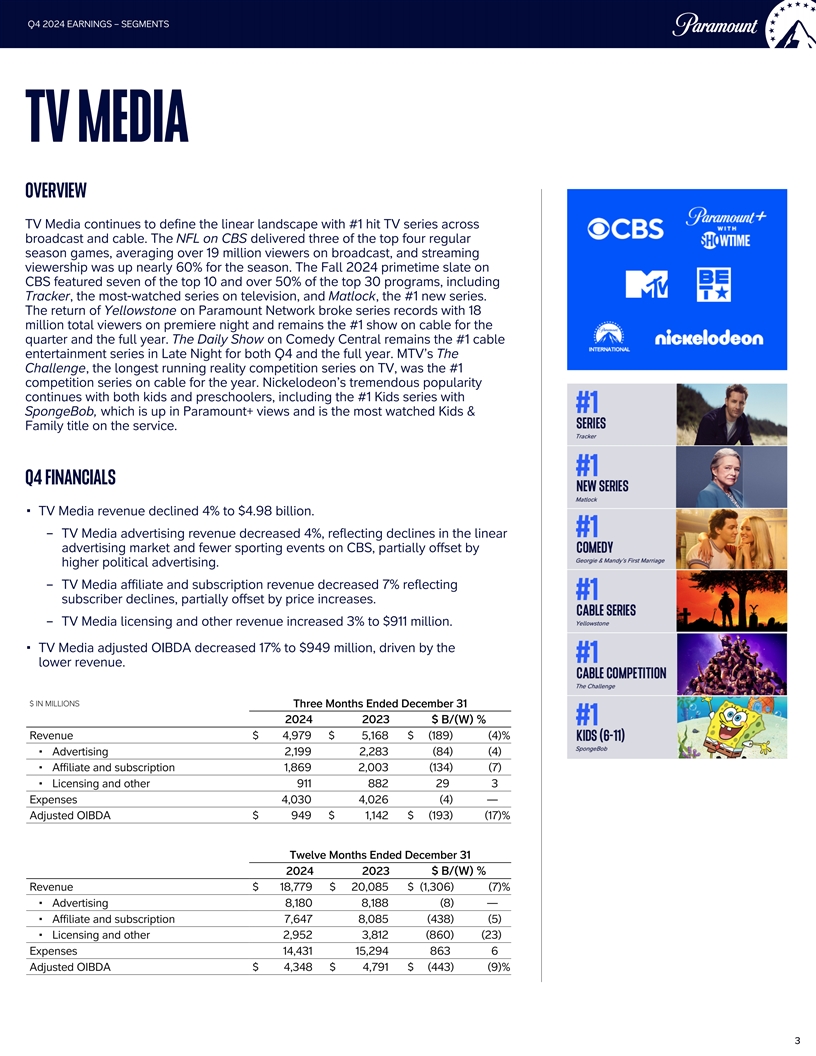 2024年第四季度收益–分部电视媒体概览电视媒体继续定义线性景观,在广播和有线电视中排名第一的热门电视剧。CBS的NFL转播了常规赛前四场比赛中的三场,平均转播观众人数超过1900万,流媒体收视率本赛季增长了近60%。美国哥伦比亚广播公司(CBS)的2024年秋季黄金时段节目中,前10名中有7个节目,前30名中有超过50%的节目,其中包括电视上收视率最高的电视剧《追踪者》(Tracker)和排名第一的新剧集《马特洛克》(Matlock)。《黄石》在派拉蒙电视网的回归打破了系列纪录,首播之夜的总观众人数达到了1800万,并且仍然是本季度和全年有线电视上排名第一的节目。The Daily Show on Comedy Central remains # 1 Cable Entertainment Series in Late Night for Q4 and the full year。MTV的The Challenge是电视上运行时间最长的现实竞赛系列,是有线电视年度排名第一的竞赛系列。Nickelodeon在儿童和学龄前儿童中的巨大人气仍在继续,包括与海绵宝宝合作的# 1 Kids系列,该系列在派拉蒙+的浏览量中上升,是该服务上最受关注的Kids & Family标题。Q4财报1883▪电视媒体营收下降4%,至49.8亿美元。– TV Media广告收入下降4%,反映出线性广告市场下滑和CBS体育赛事减少,部分被政治广告增加所抵消。– TV Media附属公司和订阅收入下降7%,反映出海绵宝宝挑战:美国订阅用户下降,部分被价格上涨所抵消。– TV Media授权及其他收入增长3%,至9.11亿美元。资料来源:Nielsen Media Research▪TV Media调整后OIBDA下降17%至9.49亿美元,受收入下降推动。百万美元截至2024年12月31日止三个月2023年$ B/(W)%收入$ 4,979 $ 5,168 $(189)(4)%截至9月30日止三个月百万美元▪广告2,1992,283(84)(4)20222021 $ B/(W)%▪加盟和订阅1,8692,003(134)(7)收入$ 4,948 $ 5,220 $(272)(5)%▪发牌及其他911882293▪广告1,9732,039(66)(3)费用4,0304,026(4)—▪附属公司和认购2,0002,108(108)(5)调整后OIBDA $ 949 $ 1,142 $(193)(17)%▪许可和其他9751,073(98)(9)费用3,7173,8351183截至12月31日的十二个月调整后OIBDA $ 1,231 $ 1,385 $(154)(11)% 20242023 $ B/(W)%收入$ 18,779 $ 20,085 $(1,306)(7)%截至9月30日的九个月百万美元▪广告8,1808,188(8)— 20222021 $ B/(W)%▪加盟和订阅7,6478,085(438)(5)收入$ 15,849 $ 16,432 $(583)(4)%▪许可及其他2,9523,812(860)(23)▪广告6,6687,230(562)(8)费用14,43115,2948636▪关联和订阅6,1566,303(147)(2)调整后OIBDA $ 4,348 $ 4,791 $(443)(9)%▪许可和其他3,0252,8991264费用11,69411,778841调整后OIBDA $ 4,155 $ 4,654 $(499)(11)% 33资料来源:尼尔森媒体研究