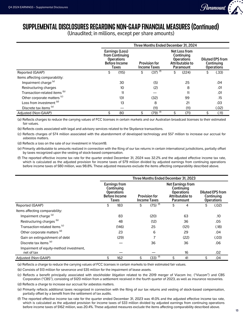 2024年第四季度收益–补充披露关于非公认会计原则财务措施的补充披露(续)(未经审计;以百万计,每股金额除外)截至12月31日的三个月,2024年收益(亏损)来自持续持续经营业务的净亏损从收入拨备前稀释每股收益对于归属于持续税项的所得税派拉蒙运营(f)报告(GAAP)$(115)$(37)$(224)$(.33)影响可比性的项目:(a)减值费用30(5)25.04重组费用。01 10(2)8(b)交易相关项目11 — 11.01(c)其他公司事项131(32)99.15(d)投资损失13821.03(e)(.02)离散税项——(11)(11)(f)调整后(Non-GAAP)$ 80 $(79)$(71)$(.11)(a)反映降低某些市场FCC许可证账面价值的费用和我们的澳大利亚广播许可证到他们估计的公允价值。FBI(b)反映了与Skydance交易相关的法律和咨询服务相关的成本。(c)反映了与放弃已开发技术相关的7400万美元的费用和5700万美元用于增加我们对石棉事项的应计费用。(d)反映出售我们在Viacom18的投资的亏损。(e)主要归因于在某些国际司法管辖区提交我们的纳税申报表所实现的金额,部分被基于股票的补偿归属时确认的税款所抵消。(f)截至2024年12月31日止季度报告的实际所得税率为32.2%,经调整的实际所得税率为98.8%,其计算方法为经调整的所得税拨备7900万美元除以经调整的所得税前持续经营业务收益8000万美元。这些调整后的措施不包括上述影响可比性的项目。截至12月31日的三个月,2023年持续持续经营业务净收益收益从收入拨备前稀释每股收益归属于持续税项的所得税派拉蒙运营(f)报告(GAAP)183美元(75)4美元(.02)影响可比性的项目:(a)减值费用83(20)63.10(b)截至9月30日的三个月重组费用48(12)36.05美元(百万)(c)交易相关项目(146)25(121)(.18)20222021 $ B/(W)%(d)收入$ 4,948 $ 5,220 $(272)(5)%其他公司事项23629.04▪广告1,9732,039(66)(3)债务清偿收益(29)7(22)(.03)▪附属公司及认购2,0002,108(108)(5)(e)离散税项— 3636.06▪许可及其他9751,073(98)(9)权益法投资减值,费用3,7173,8351183税后净额—— 16.02调整后OIBDA $ 1,231 $ 1,385 $(154)(11)%(f)调整后(non-GAAP)$ 162 $(33)$ 41 $.04(a)反映了将某些市场的FCC许可的账面价值降低至其估计公允价值的费用。截至9月30日的9个月,百万美元(b)包括1300万美元的遣散费和3500万美元的租赁资产减值。20222021 $ B/(W)%(c)反映一项主要与2019年与维亚康姆公司(“Viacom”)和CBS Revenue $ 15,849 $ 16,432 $(583)(4)% Corporation(“CBS”)合并相关的股东诉讼相关的利益,其中包括2023年第四季度收到的1.2亿美元和解款项,以及保险赔偿。▪广告6,6687,230(562)(8)(d)反映了增加我们应计石棉事项的费用。▪附属公司和认购6,1566,303(147)(2)(e)主要反映与提交我们的纳税申报表和归属基于股票的补偿有关的确认的额外税款,▪许可和其他3,0252,8991264被结算税务审计的收益部分抵消。费用11,69411,778841(f)截至2023年12月31日的季度报告的实际所得税率为41.0%,调整后的实际所得税率,调整后的OIBDA $ 4,155 $ 4,654 $(499)(11)%,即按调整后的所得税准备金3300万美元除以调整后的所得税前持续经营收益1.62亿美元计算,为20.4%。这些调整措施不包括上述影响可比性的项目。1133资料来源:尼尔森媒体研究