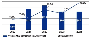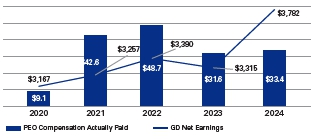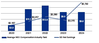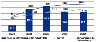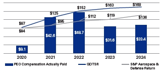 | 我们的业务在2024年表现良好。我们经历了所有四个细分市场的收入和收益稳步增长,克服了供应链中断、通胀经济和湾流G700飞机认证延迟等挑战。我们取得了纪录-高达477亿美元的营收,每股摊薄收益为13.63美元,经营活动提供的净现金为41亿美元。由于航空航天和国防业务的强劲订单,我们在年底的积压订单为906亿美元,预计合同总额达到创纪录的1440亿美元。 | ||