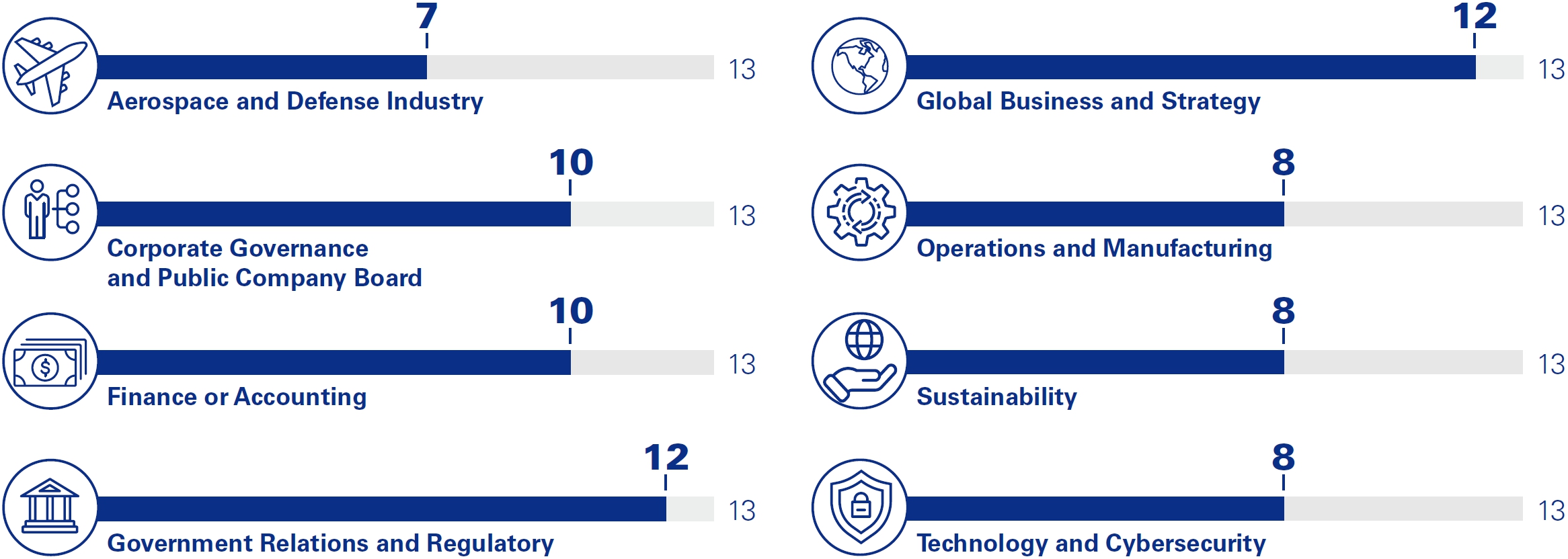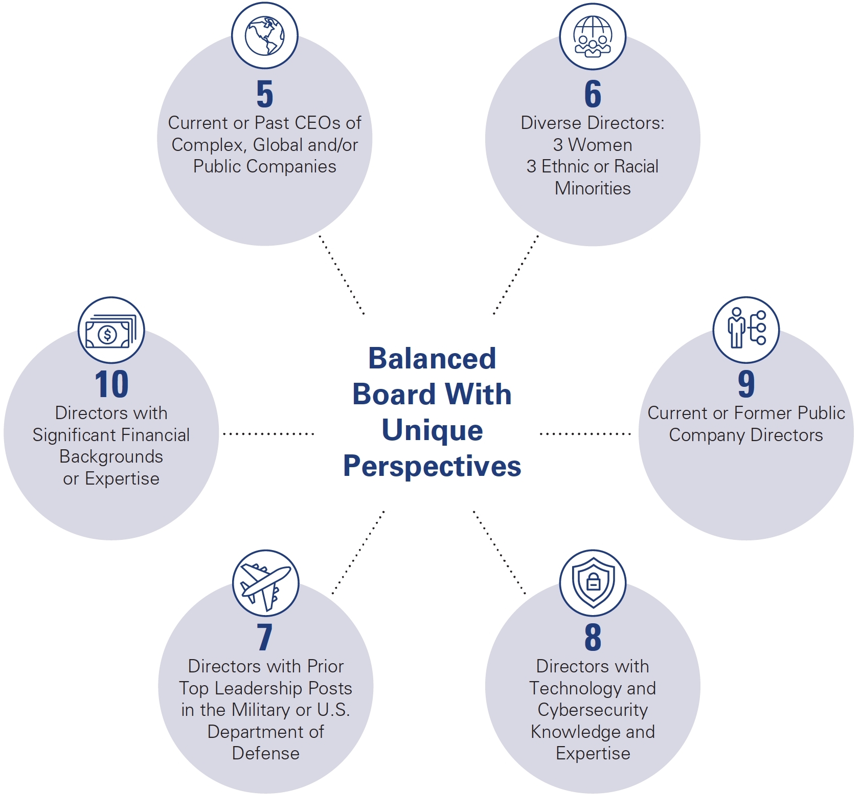 | 由于我们深思熟虑的董事会刷新过程,您的董事会组成良好-合格的商业领袖、航空航天和国防工业专家以及财务和战略顾问。贵司董事会在开展独立监督这一重要工作中,借鉴了这一深厚的专业经验、专门知识和广阔的人生视野。 | ||