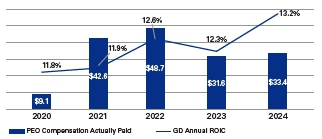 | 通用动力专注于创造长期股东价值。2024年,该公司将季度股息提高了7.6%,为连续第27次提高年度股息。