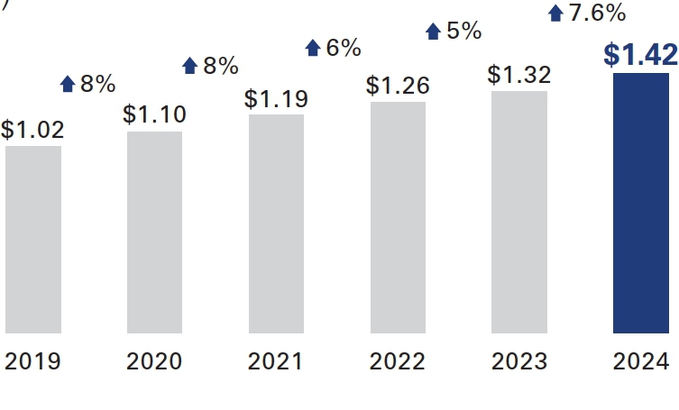 | $1.42每股 季度股息 增长7.6% 从上一年 |
