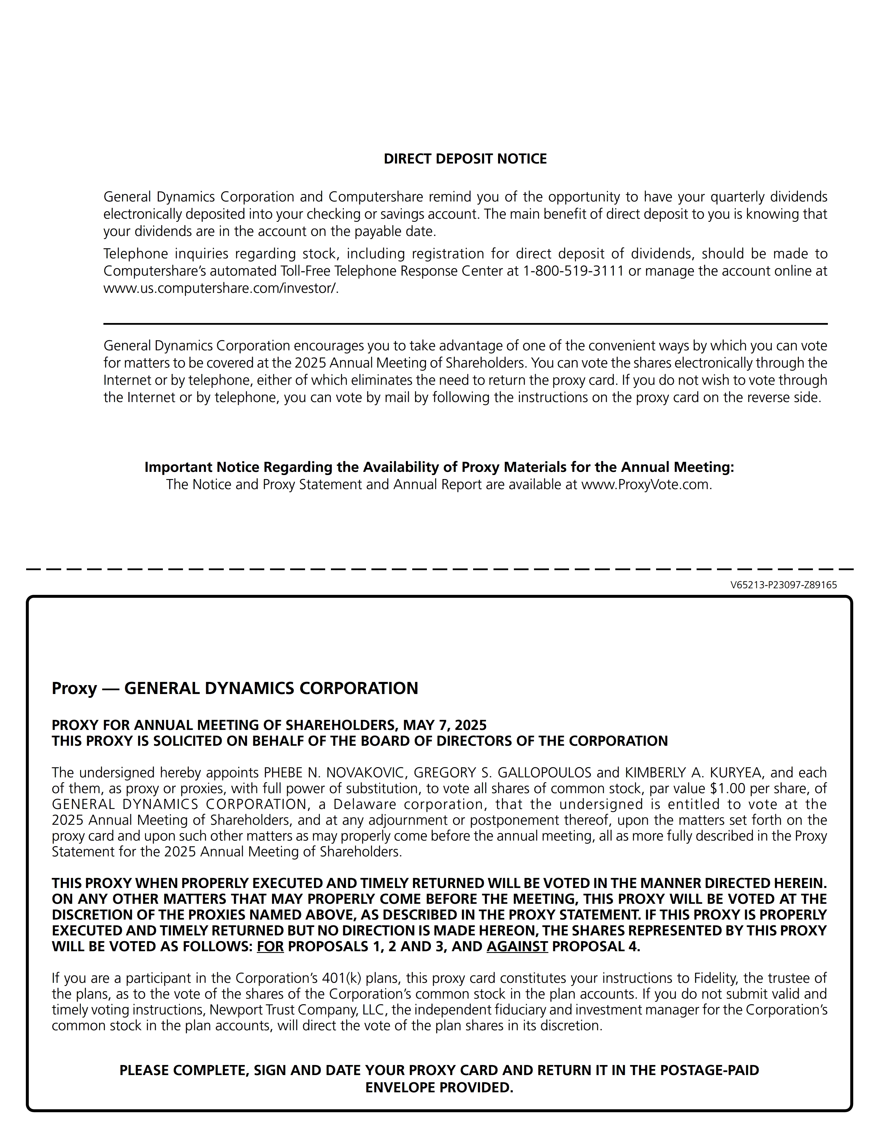 出席年会办理业务必须达到法定人数的股份。法定人数是指截至2025年3月12日(记录日期)收盘时,公司普通股大多数已发行和流通股的持有人以虚拟方式亲自或通过代理人出席。于记录日期,通用动力已发行及流通的普通股为268,381,817股。