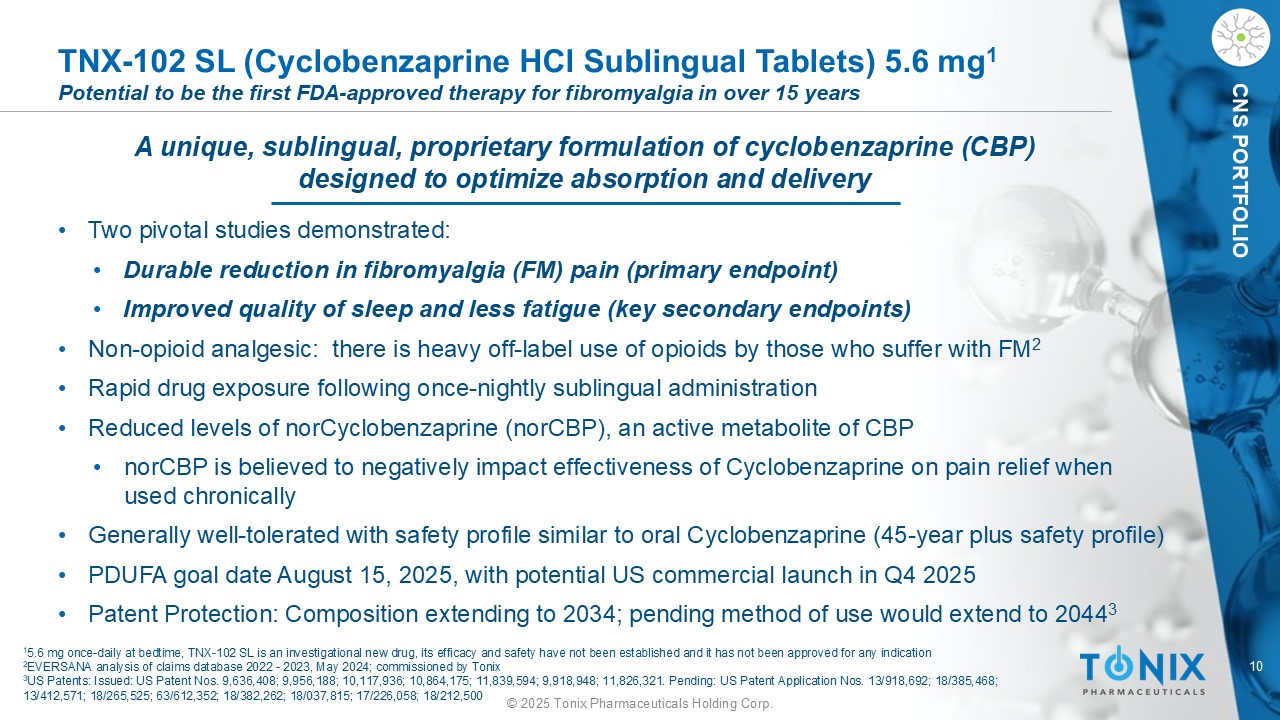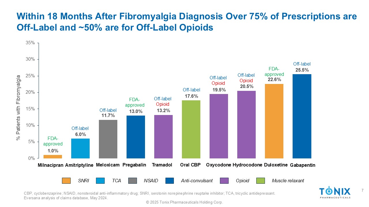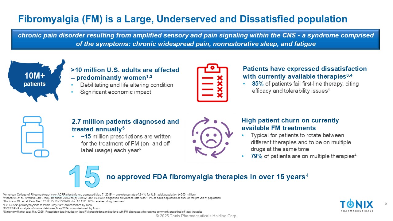 ©2025 Tonix Pharmaceuticals Holding Corp.纤维肌痛(FM)是一种由中枢神经系统内放大的感觉和疼痛信号传导引起的、服务不足和不满意的大型人群慢性疼痛疾病——该综合征由以下症状组成:慢性广泛性疼痛、非恢复性睡眠,每年诊断和治疗270万患者5 •~1500万张处方用于治疗FM(标签上和标签外使用)每年6个10M +患者> 1000万美国成年人受到影响——主要是女性1,2 •使人衰弱和改变生活的状况•显着的经济影响患者对目前可用的疗法表示不满3,4• 85%的患者未能通过一线治疗,引用疗效和耐受性问题4目前可用的FM治疗的患者流失率高•典型的患者在不同疗法之间轮换并同时服用多种药物• 79%的患者正在接受多种疗法4在超过15年内没有获得FDA批准的纤维肌痛疗法41美国风湿病学会(www.ACRPatientInfo.org于2019年5月7日访问)–美国成年人口(~2.5亿)的流行率为2-4 % 2 Vincent A,et al. Artritis Care Res(Hoboken)。2013年65(5):786-92。doi:10.1002;诊断流行率为成年人口的1.1%或流行人口的50% 3 Robinson RL,et al. Pain Med. 2012年13(10):1366-76。doi:10.1111;85%接受药物治疗4 EVERSANA初级医师研究,2024年5月;受Tonix委托5 EVERSANA对索赔数据库的分析,2024年5月,受Tonix委托。6 Symphony Market Data,May 2025。处方数据包括标签上的FM处方和接受d常用处方的非标签疗法的FM诊断患者6