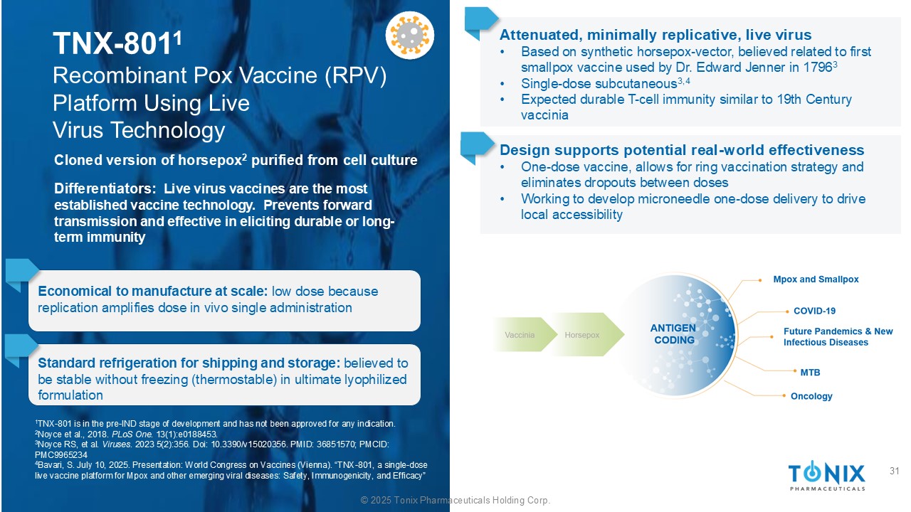 ©2025 Tonix Pharmaceuticals Holding Corp. TNX-8011使用活病毒技术的重组痘疫苗(RPV)平台经济规模生产:l ow剂量,因为复制放大了体内单次给药的剂量标准冷藏运输和储存:相信在没有冷冻的情况下是稳定的(热稳定性)在终极冻干配方中减毒、最小复制、活病毒•基于合成马痘-载体,被认为与Edward Jenner博士在1796年使用的第一个天花疫苗有关3 •单剂量皮下3,4 •预期的类似于19世纪牛痘的持久T细胞免疫从细胞培养分化子中纯化的马痘2的克隆版本:活病毒疫苗是最成熟的疫苗技术。预防前向传播并有效引发持久或长期免疫1 TNX-801处于pre-IND开发阶段,尚未被批准用于任何适应症。2 Noyce等人,2018年。PLOS一。13(1):e0188453。3 Noyce RS,et al.病毒。2023 5(2):356.Doi:10.3390/v15020356。PMID:36851570;PMCID:PMC9965234 4 Bavari,S. 2025年7月10日。介绍:世界疫苗大会(维也纳)。“TNX-801,针对MPOX和其他新出现的病毒性疾病的单剂量活疫苗平台:安全性、免疫原性和有效性”设计支持潜在的真实世界有效性•一剂疫苗,允许环形接种策略并消除剂量之间的辍学率•致力于开发微针一剂递送,以推动当地的可及性31