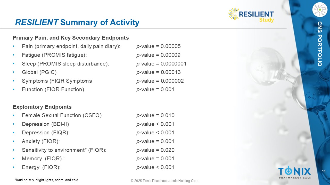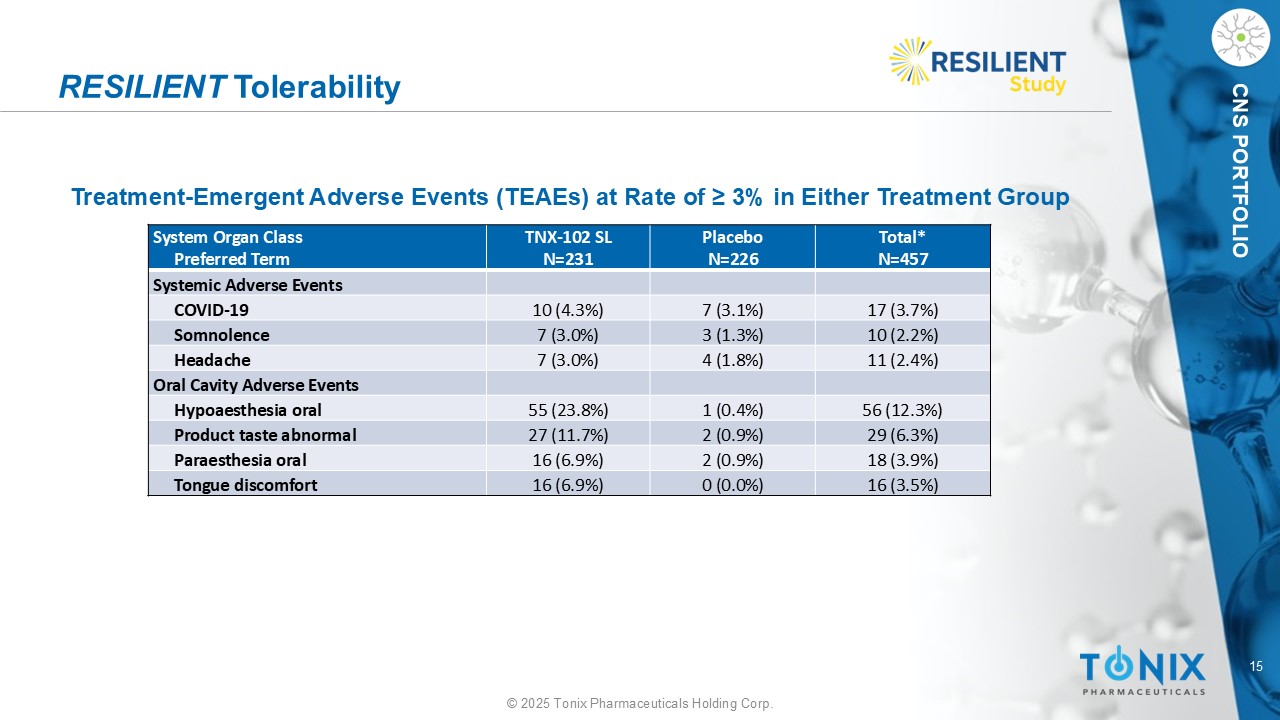14©2025 Tonix Pharmaceuticals Holding Corp. CNS PortFOLIO Resilient活动原发性疼痛总结,以及关键次要终点•疼痛(主要终点,每日疼痛日记):p-value = 0.00005 •疲劳(PROMIS疲劳):p-value = 0.00009•睡眠(PROMIS睡眠障碍):p-value = 0.0000001 •全局(PGIC)p-value = 0.00013 •症状(FIQR症状p-value = 0.000002 •功能(FIQR功能)p-value = 0.00 1探索终点•女性性功能(CSFQ)p-value = 0.010 •抑郁(BDI-II)p-value < 0.001•抑郁(FIQR):p-value < 0.001•焦虑(FIQR):p-value = 0.001•对环境的敏感性*(FIQR):p-value =0.020 •内存(FIQR):p-value = 0.00 1 •能源(FIQR):p-value < 0.00 1*巨大的噪音、明亮的灯光、气味和寒冷