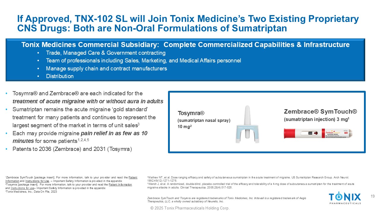 ©2025 Tonix Pharmaceuticals Holding Corp.如果获得批准,TNX-102 SL将加入Tonix Medicine现有两款专有CNS药物:均为非口服制剂的舒马曲坦• Tosymra®和Zembrace®分别适用于成人有或无先兆的急性偏头痛的tr吃•舒马曲坦仍然是许多患者的急性偏头痛‘黄金标准’治疗,并继续代表着按单位销售额计算的最大细分市场3 •每一种都可能为一些患者在短短10分钟内提供偏头痛疼痛缓解1,2,4,5 •到2036年的专利(Zembrace)和2031(Tosymra)1 Zembrace SymTouch [封装插入]。欲了解更多信息,请咨询您的提供者并阅读患者信息和使用说明。–重要的安全信息在附录2 Tosymra [封装插入]中提供。欲了解更多信息,请与您的提供者交谈并阅读患者信息和使用说明–重要的安全信息在附录3 Tonix Medicines,Inc.中提供;Data on File,2023 Zembrace®SymTouch®(舒马曲坦注射液)3 mg 1 Tosymra®(舒马曲坦鼻喷雾剂)10mG2 Tonix Medicines商业子公司:完整的商业化能力和基础设施•贸易、管理式护理和政府承包•包括销售、营销和医疗事务人员在内的专业团队•管理供应链和合同制造商•分销4 Mathew NT,皮下舒马曲坦治疗偏头痛急性的剂量范围疗效及安全性。美国苏门答腊pta n研究小组。Arch Neurol。1992;49(12):1271 - 1276.5 Wendt J,et al.一项随机、双盲、安慰剂对照试验,研究4mg剂量皮下注射舒马曲坦治疗成人急性偏头痛发作的疗效和耐受性。临床治疗。2006;28(4):517 - 526.Zembrace SymTouch和Tosymra是Tonix Medicines,Inc.的注册商标。Intravail是Neurelis,Inc.的全资子公司Aegis Therapeutics,LLC的注册商标。19