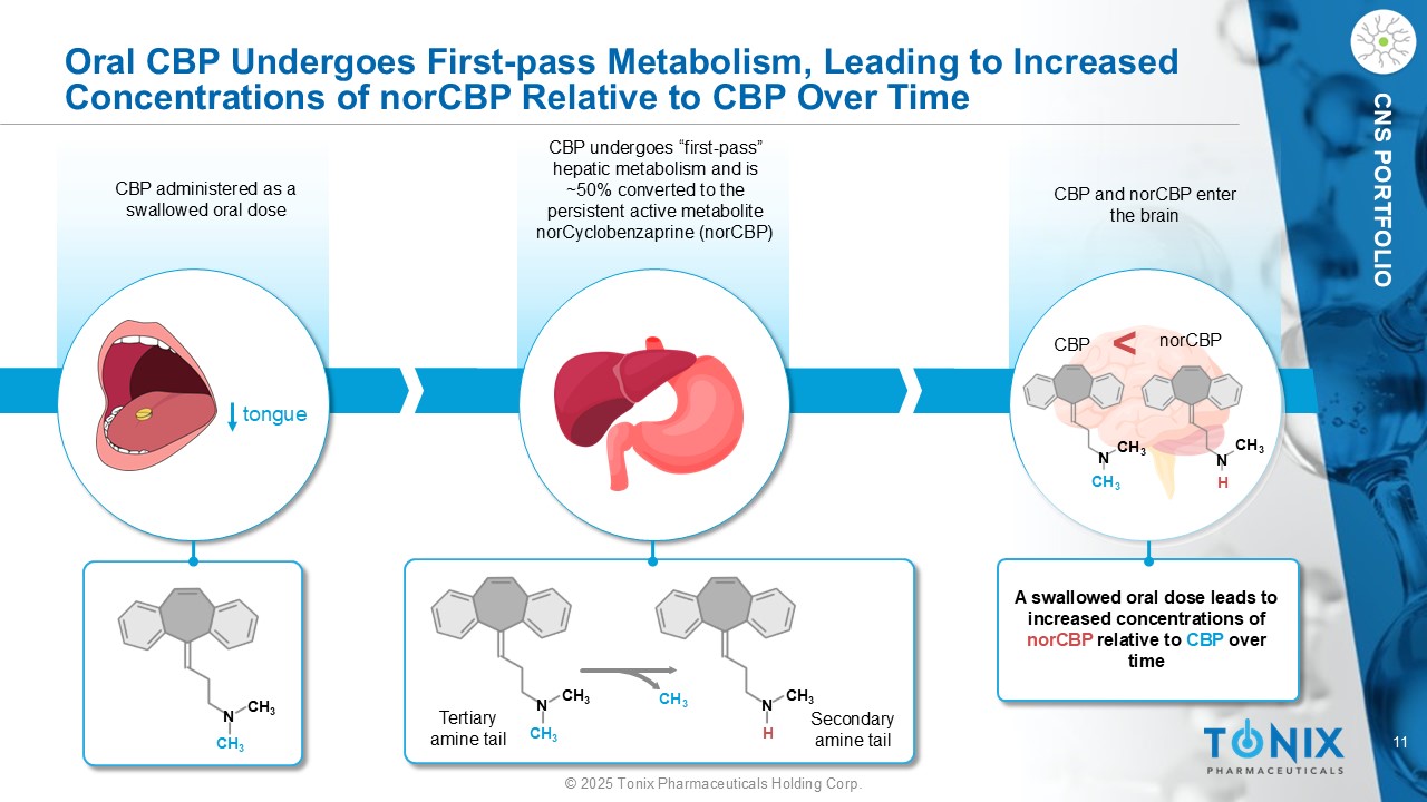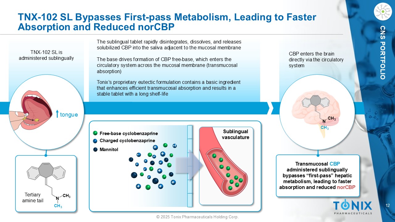 11©2025 Tonix Pharmaceuticals Holding Corp. CNS组合CBP和norCBP进入大脑口服CBP经历首过代谢,随着时间的推移导致相对于CBP的norCBP浓度增加舌头CBP作为吞咽口服剂量给药CBP经历“首次通过”肝脏代谢并被~50%转化为持久性活性代谢物norCyclobenzaprine(norCBP)CH 3 N CH 3 CH 3 N CH 3 CH 3 CH 3 N H CH 3 N CH 3 CH 3 CH 3 N CH 3 N H A吞咽口服剂量导致相对于CBP的norCBP浓度随着时间的推移而增加< CBP norCBP仲胺尾叔胺尾