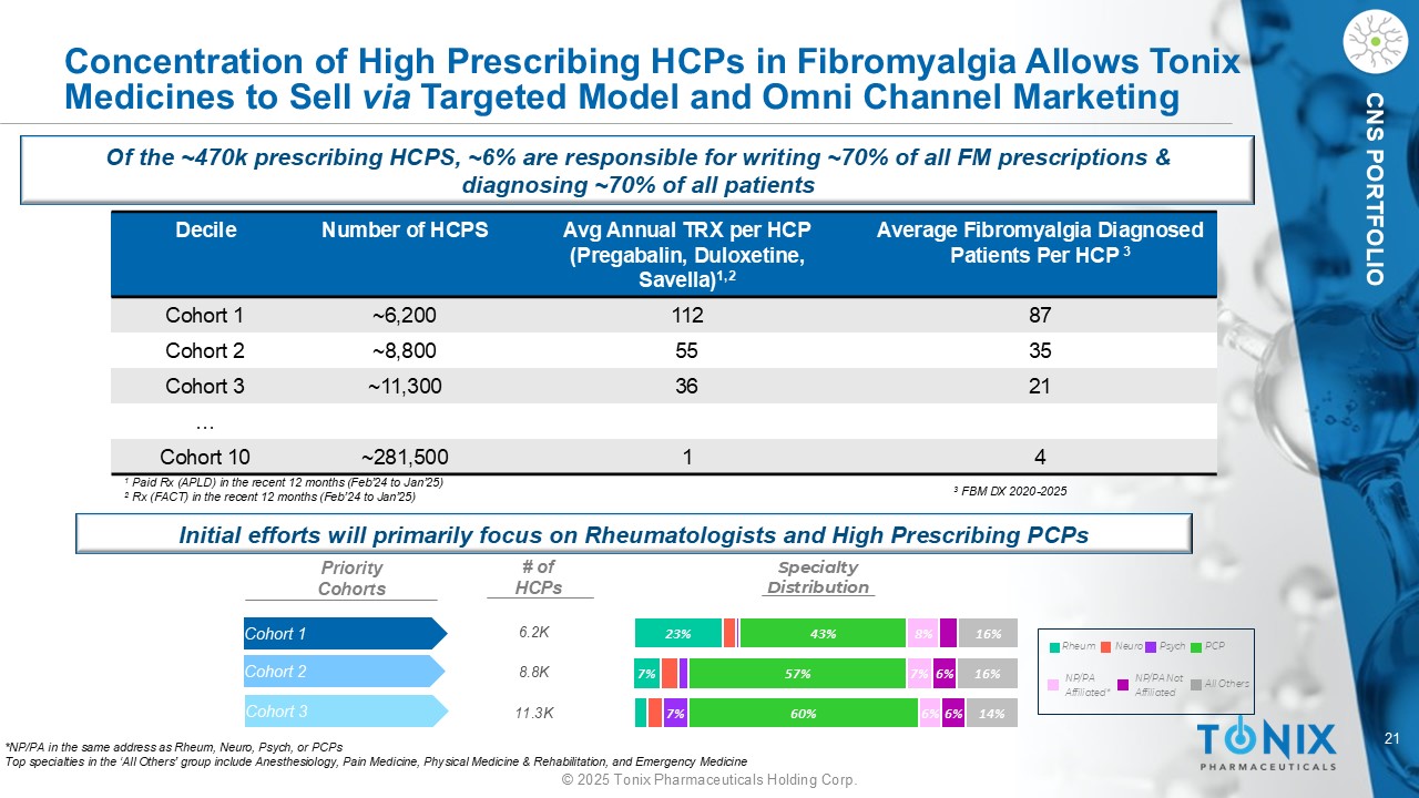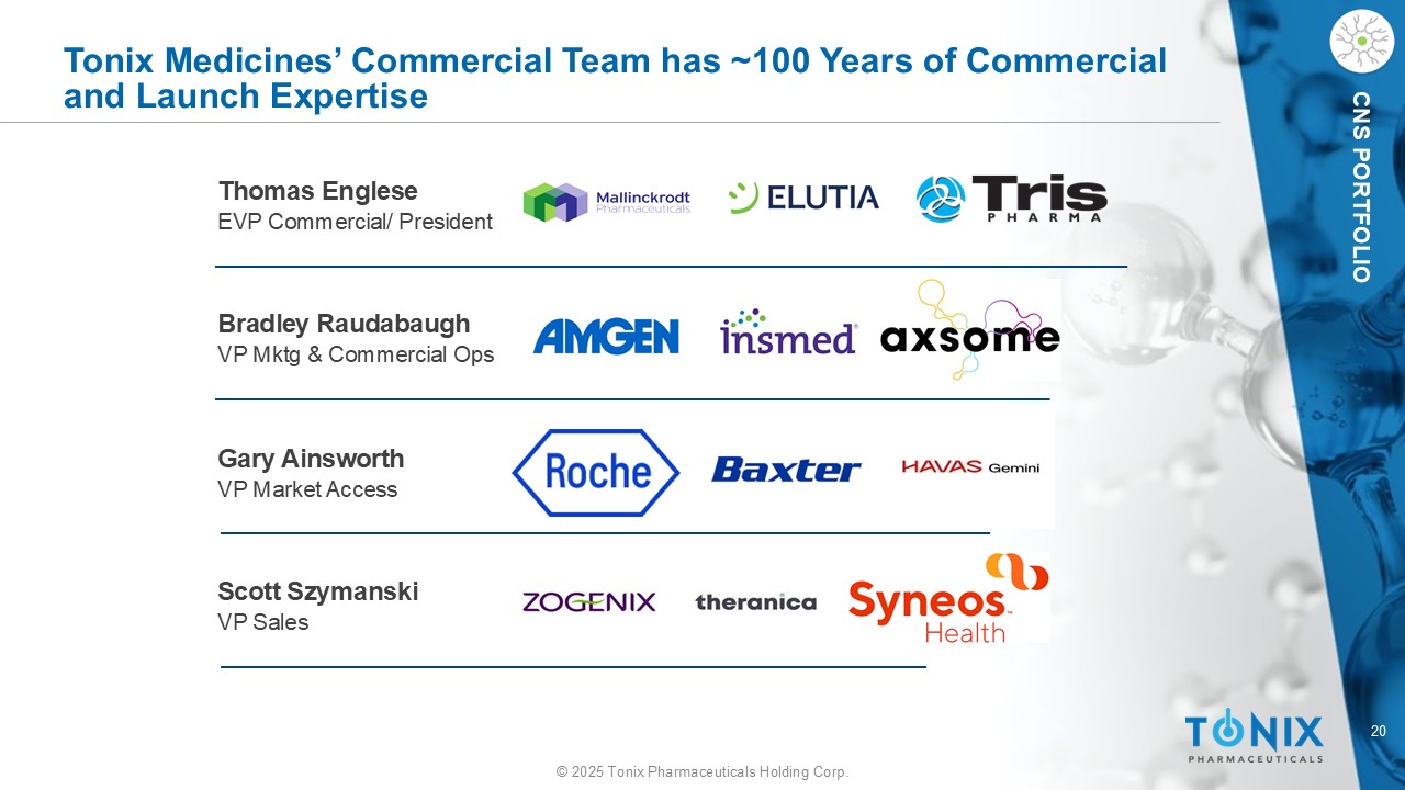 20©2025 Tonix Pharmaceuticals Holding Corp. CNS PortFOLIO Tonix Medicines的商业团队拥有~100年的商业和发布专长Thomas Englese执行副总裁商业/总裁Scott Szymanski销售副总裁Bradley Raudabaugh MKTG和商业运营副总裁Gary Ainsworth市场准入