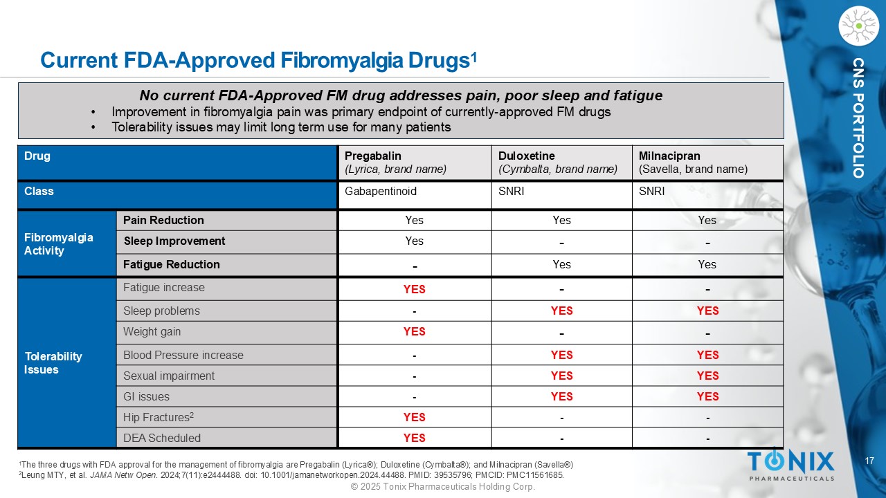 16©2025 Tonix Pharmaceuticals Holding Corp. CNS投资组合耐受性活性和耐受性活性总结:TNX-102 SL具有“广谱”或“综合征”活性•广谱:跨越几个症状的活性•综合征:改善综合征(大多数症状)更接近问题的根源•广谱药物减少多种药物使用或“多药房”耐受性的潜力:TNX-102 SL通常耐受性良好• TNX-102 SL治疗的患者中有3%出现嗜睡和头痛v.1.3 %和1.8%的安慰剂对照组,分别是结合活性和耐受性的纤维肌痛药物的潜力•可能解决医生不愿做出纤维肌痛诊断的问题•可能支持长期使用(持久性)