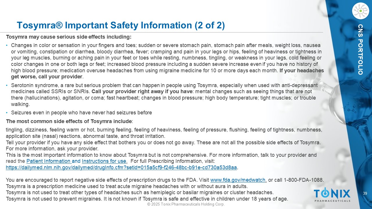38©2025 Tonix Pharmaceuticals Holding Corp. CNS投资组合Tosymra®重要安全信息(1 of 2)Tosymra®会导致严重的副作用,包括心脏病发作和其他心脏问题,可能导致死亡。停止Tosymra并获得紧急医疗帮助如果你有任何心脏病发作的迹象:• D持续超过几分钟的胸部中央舒适或消失并复发;胸部、喉咙、颈部或下巴严重紧绷、疼痛、压力或沉重;手臂、背部、颈部、下巴疼痛或不适,或胃;有或没有胸部不适的呼吸急促;突然出冷汗;恶心或呕吐;感到头晕目眩Tosymra不适用于有心脏病风险因素(高血压或胆固醇、吸烟、超重、糖尿病、心脏病家族史)的人,除非做了心脏检查并显示没有问题。如有以下情况,请勿使用Tosymra:• H心脏问题的历史;血管狭窄至腿、手臂、胃、肾(外周血管疾病);无法控制的高血压;严重的肝脏问题;偏瘫或基底性偏头痛。如果你不确定自己是否有这些,问问你的医疗保健提供者。• H或中风、短暂性脑缺血发作(TIA)或血液循环出现问题;在过去24小时内服用以下任一药物:阿莫曲普坦、依立普坦、氟伐曲普坦、那拉曲普坦、利扎曲普坦、麦角胺或二氢麦角胺。询问您的提供者,如果您不确定您的药物是否在上面列出•正在服用某些抗抑郁药,称为单胺氧化酶(MAO)-A抑制剂,或者您停止服用MAO-A抑制剂已有2周或更短时间。如果您不确定,请向您的提供者询问这些药物的清单•对舒马曲坦或Tosymra中的任何成分过敏告诉您的提供者您的所有医疗状况和您服用的药物,包括维生素和补充剂。Tosymra会导致头晕、虚弱或嗜睡。如果是,不要开车,不要使用机械,也不要做任何需要警惕的事情。