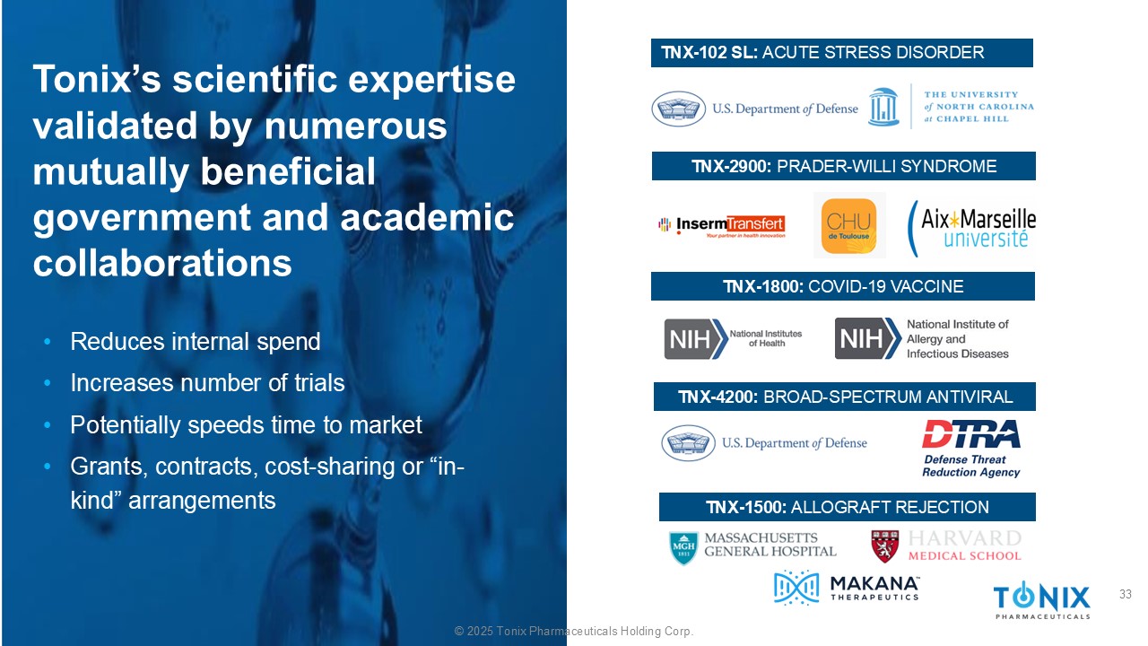 ©2025 Tonix Pharmaceuticals Holding Corp. Tonix的科学专长已得到众多互利的政府和学术合作的验证•减少内部支出•增加试验数量•可能加快上市时间•赠款、合同、成本分摊或“实物”安排TNX-1500:同种异源排斥TNX-1800:COVID-19疫苗TNX-2900:PRADER-WILLI SYNDROME TNX-102 SL:急性应激障碍TNX-4200:Broad-Spectrum AntiViral 33