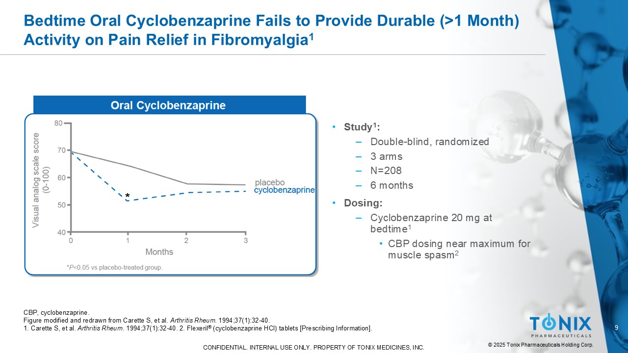9©2025 Tonix Pharmaceuticals Holding Corp.机密性。仅限内部使用。TONIX Medicines,INC.的财产。睡前口服环苯扎普林未能提供持久(> 1个月)的活性缓解纤维肌痛1 CBP,环苯扎普林。Figure modified and redrawn from Carette S,et al.关节炎rheum。1994;37(1):32 - 40.1.CARETE S,et al.关节炎类风湿。1994;37(1):32 - 40.2.Flexeril®(环苯扎普林HCL)片[处方信息]。•研究1:丨双盲、随机丨3组丨N = 208-6个月•给药:丨环苯扎普林20mg睡前1 •肌肉痉挛的CBP给药接近最大值2