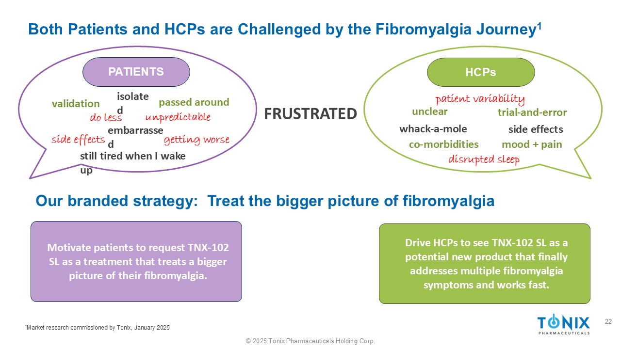 ©2025 Tonix Pharmaceuticals Holding Corp.患者和HCP都受到了纤维肌痛旅程1的挑战FRUSTRATED激励患者要求TNX-102 SLS作为一种治疗他们的纤维肌痛的更大图景的治疗方法。驱动HCPs将TNX-102 SL视为一种潜在的新产品,最终解决了多种纤维肌痛症状并快速起作用。我们的品牌策略:治疗纤维肌痛的大局患者验证孤立尴尬做更少不可预测的副作用变得更糟通过HCP不明确的试验-和-错误重击-a-痣副作用情绪+疼痛患者变异性共病1由Tonix委托进行的市场研究,2025年1月,当我醒来时仍然很累扰乱了睡眠22
