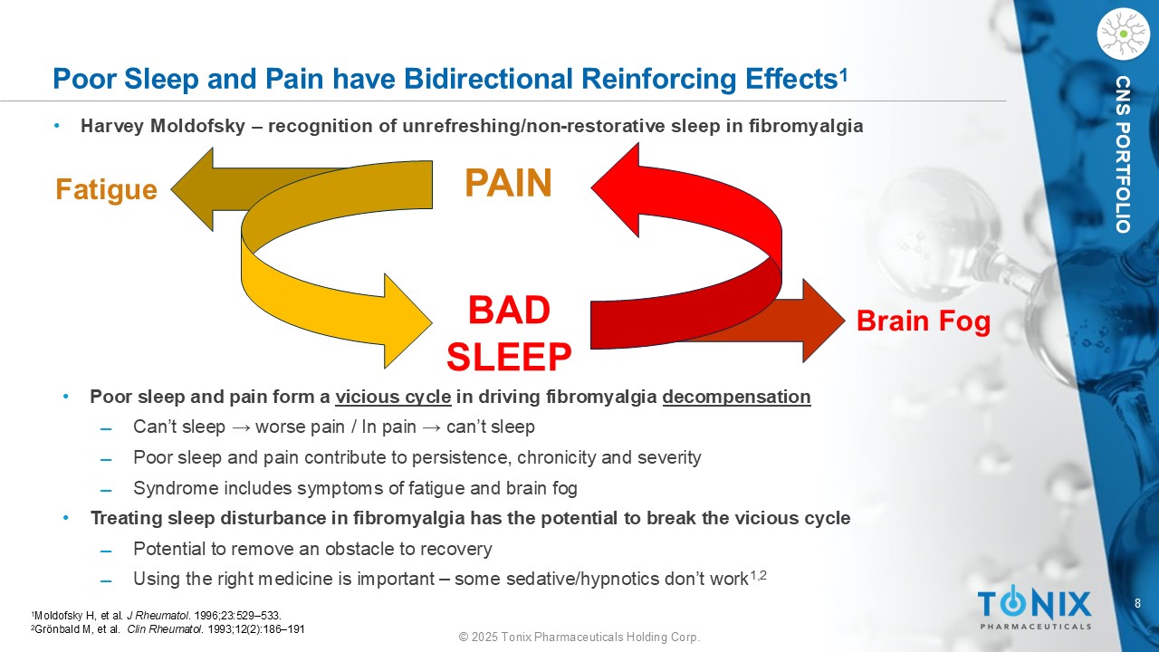 8©2025 Tonix Pharmaceuticals Holding Corp. CNS投资组合睡眠差和疼痛具有双向强化作用11 Moldofsky H,et al. J Rheumatol。1996;23:529 – 533.2 Gr ö nbald M,et al. Clin Rheumatol。1993;12(2):186 – 191 • Harvey Moldofsky –认识到纤维肌痛中的不清爽/非恢复性睡眠•睡眠不良和疼痛形成驱动纤维肌痛失代偿的恶性循环——睡不着→更糟糕的疼痛/在疼痛中→睡不着——睡眠不良和疼痛有助于持续,慢性症和严重性—综合征包括疲劳和脑雾症状•治疗纤维肌痛的睡眠障碍有可能打破恶性循环—消除康复障碍的潜力—使用正确的药物很重要–一些镇静剂/催眠药不起作用1,2疼痛不好的睡眠疲劳脑雾