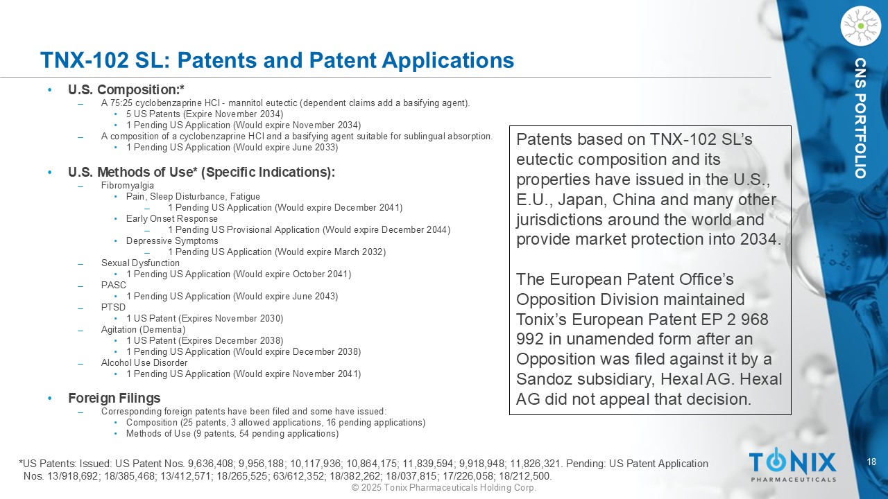 18©2025 Tonix Pharmaceuticals Holding Corp. CNS投资组合TNX-102 SL:专利和专利申请•美国成分:*— A 75:25环苯扎普林HCL-甘露醇共晶(依赖声明添加碱化剂)。• 5项美国专利(2034年11月到期)• 1项美国申请待审(2034年11月到期)—一种盐酸环苯扎普林的组合物和一种适用于舌下吸收的碱化剂。• 1项待美国申请(将于2033年6月到期)•美国使用方法*(具体适应症):丨纤维肌痛•疼痛,睡眠障碍,疲劳丨1项美国未决申请(将于2041年12月到期)•早发性反应丨1项美国临时申请(将于2044年12月到期)•抑郁症状丨1项美国未决申请(将于2032年3月到期)丨性功能障碍• 1项美国未决申请(将于2041年10月到期)丨PASC • 1项美国未决申请(将于2043年6月到期)丨PTSD • 1项美国专利(将于2030年11月到期)丨躁动(痴呆)• 1项美国专利(将于2038年12月到期)• 1项美国未决申请(将于2038年12月到期)丨酒精使用障碍• 1项美国未决申请(将于2041年11月到期)•国外备案—已申请相应国外专利,部分已颁发:•组成(25项专利、3项允许申请、16项待申请)•使用方法(9项专利、54项待申请)*美国专利:已发布:美国专利号:9,636,408;9,956,188;10,117,936;10,864,175;11,839,594;9,918,948;11,826,321。待决:美国专利申请第13/918,692号;18/385,468号;13/412,571号;18/265,525号;63/612,352号;18/382,262号;18/037,815号;17/226,058号;18/212,500号。基于TNX-102 SL的共晶成分及其性质的专利已在美国、欧盟、日本、中国和世界各地的许多其他司法管辖区颁发并提供市场保护到2034年。在Sandoz子公司Hexal AG对Tonix提出异议后,欧洲专利局的反对部门维持Tonix的欧洲专利EP 2 968992的未经修正的形式。Hexal AG没有对该决定提出上诉。