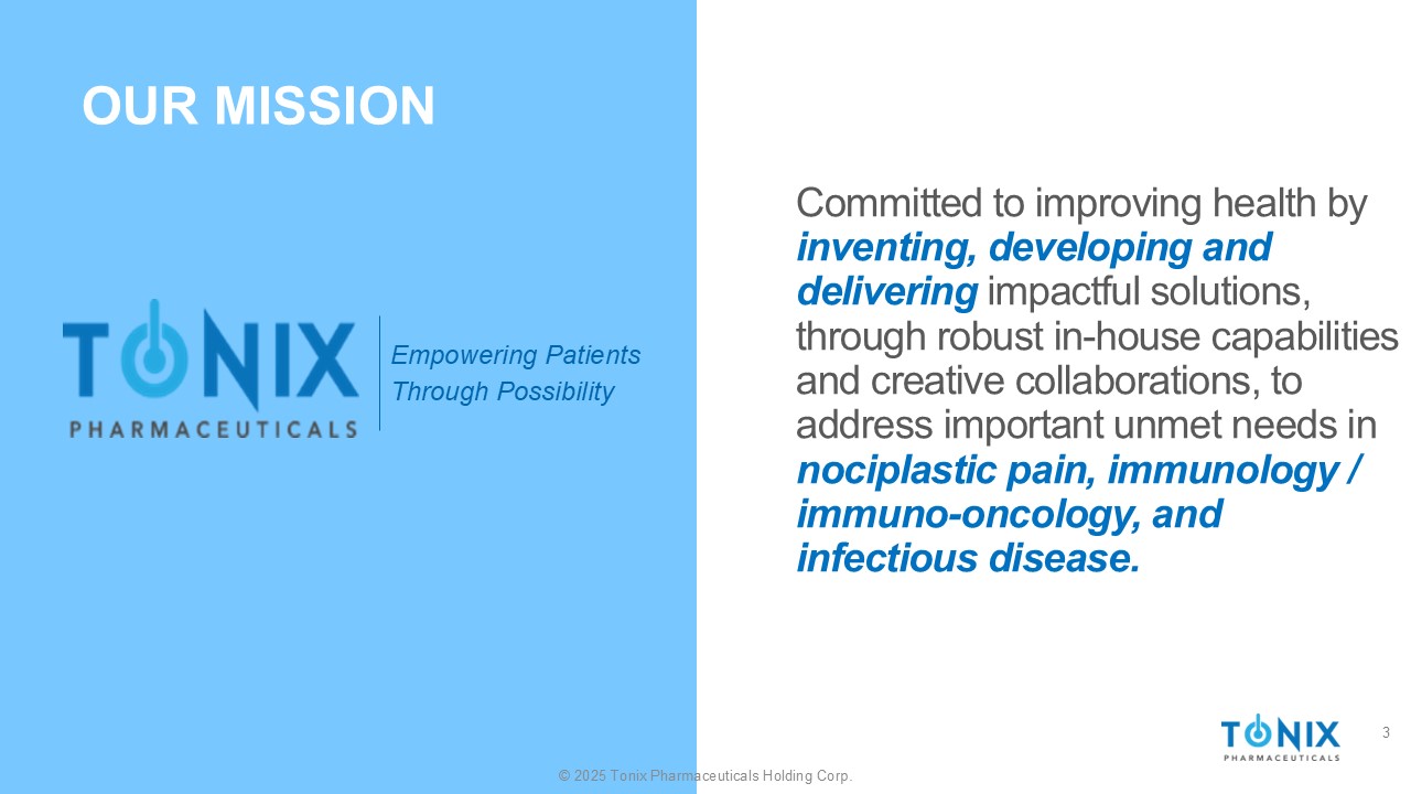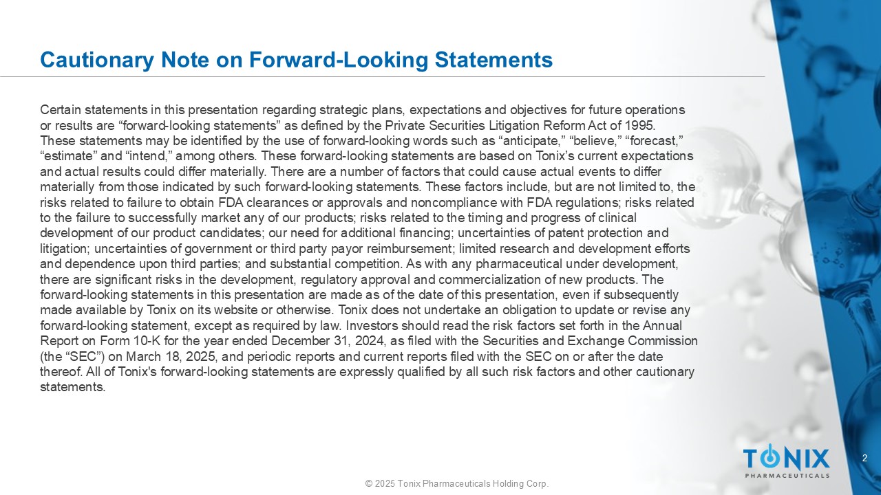 2©2025 Tonix Pharmaceuticals Holding Corp.关于前瞻性陈述的注意事项本演示文稿中有关未来运营或结果的战略计划、预期和目标的某些陈述是1995年《私人证券诉讼改革法案》所定义的“前瞻性陈述”。这些陈述可以通过使用“预期”、“相信”、“预测”、“估计”和“打算”等前瞻性词语来识别。这些前瞻性陈述基于Tonix目前的预期,实际结果可能存在重大差异。有许多因素可能导致实际事件与此类前瞻性陈述所表明的情况存在重大差异。这些因素包括但不限于与未能获得FDA许可或批准以及不遵守FDA法规相关的风险;与我们的任何产品未能成功上市相关的风险;与我们的候选产品临床开发的时间和进度相关的风险;我们对额外融资的需求;专利保护和诉讼的不确定性;政府或第三方付款人报销的不确定性;有限的研发努力和对第三方的依赖;以及实质性竞争。与任何在研药品一样,新产品的开发、监管批准和商业化都存在重大风险。本演示文稿中的前瞻性陈述是在本演示文稿发布之日作出的,即使随后由Tonix在其网站或其他网站上提供。除法律要求外,Tonix不承担更新或修改任何前瞻性陈述的义务。投资者应阅读于202年3月18日向美国证券交易委员会(“SEC”)提交的截至2024年12月31日止年度的10-K表格年度报告5中列出的风险因素,以及在该日期或之后向SEC提交的定期报告和当前报告。Tonix的所有前瞻性陈述都明确受到所有此类风险因素和其他警示性陈述的限制。