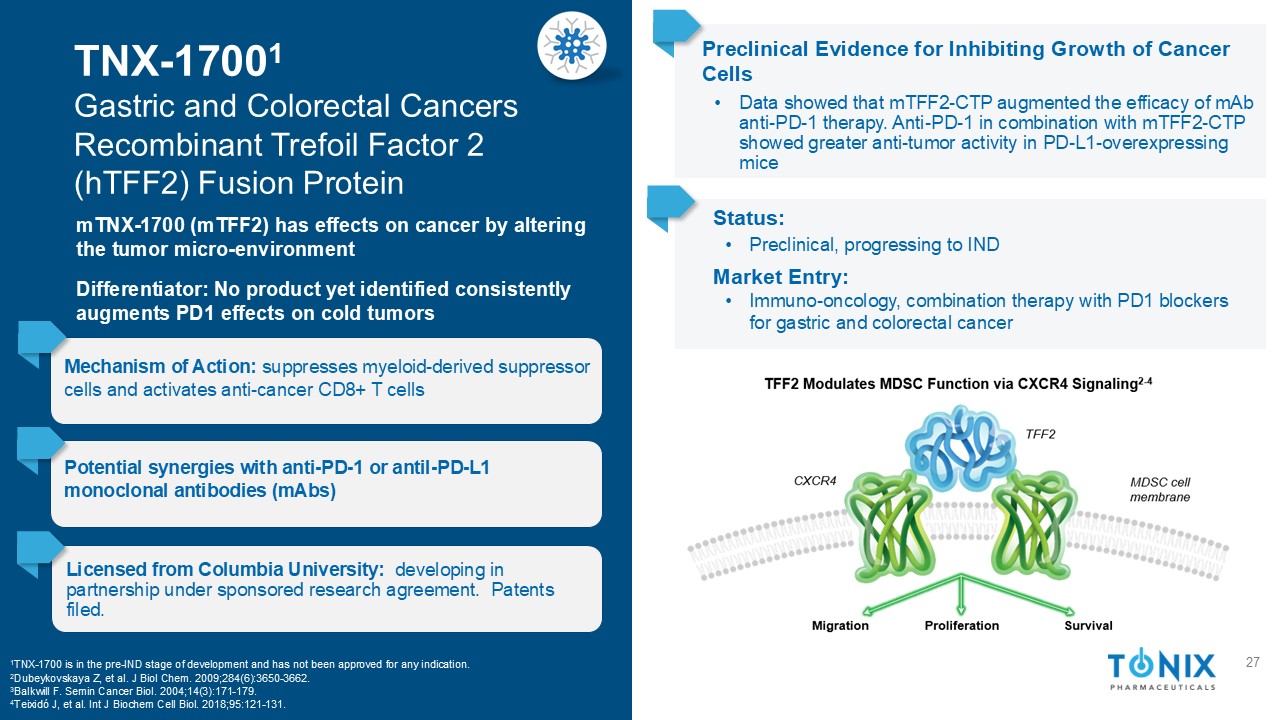 TNX-17001胃癌和结直肠癌重组三叶因子2(HTFF2)融合蛋白作用机制:抑制髓系来源的抑制细胞并激活抗癌CD8 + T细胞与哥伦比亚大学许可的抗-PD-1或抗-PD-L1单克隆抗体(MABs)的潜在协同作用:根据赞助研究协议合作开发。申请的专利。抑制癌细胞生长的临床前证据•数据显示,mTFF2-CTP增强了mAB抗PD-1疗法的疗效。抗-PD-1联合mTFF2-CTP在PD-L1-Overexpressing小鼠中显示出更强的抗肿瘤活性mTNX-1700(mTFF2)通过改变肿瘤微环境对癌症产生影响分化子:尚未发现任何产品持续增强PD1对冷瘤的影响1 TNX-1700处于pre-IND开发阶段,尚未被批准用于任何适应症。2 Dubeykovskaya Z,et al. J Biol Chem。2009;284(6):3650 - 3662.3 Balkwill F. Semin Cancer Biol。2004;14(3):171 - 179.4 Teixid ó J,et al. Int J Biochem Cell Biol。2018;95:121 - 131.状态:•临床前,进展至IND市场进入:•免疫-肿瘤学,与PD1阻滞剂联合治疗胃癌和结直肠癌27