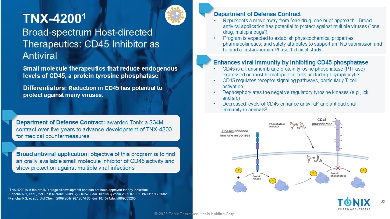 ©2025 Tonix Pharmaceuticals Holding Corp. TNX-4200 1广谱宿主导向疗法:CD45抑制剂作为抗病毒药物国防部合同:授予TNIX一份为期五年、价值3400万美元的合同,以推进TNX-4200的开发,用于医疗对策广泛的抗病毒应用:该计划的目标是找到一种口服可获得的CD45活性小分子抑制剂,并显示出对多种病毒感染的保护作用国防部合同•代表了摆脱“一药一虫”方法的举措。广泛的抗病毒应用具有预防多种病毒(“一药多虫”)的潜力。•该计划预计将建立物理化学特性、药代动力学和安全属性,以支持IND提交并资助首次人体1期临床研究小分子疗法,可降低CD45的内源性水平,CD45是一种蛋白质酪氨酸磷酸酶分泌物:CD45的降低具有预防多种病毒的潜力。1 TNX-4200处于pre-IND开发阶段,未获批任何适应症。2 Panchal RG,et al.,Cell Host Microbe。2009年6(2):162-73.doi:10.10 16/j.chom.2009.07.003。PMID:19683682。3 Panchal RG,et al. J Biol Chem。2009284(19):12874-85.doi:10.1074/jbc.m809633200通过抑制CD45磷酸酶增强V iral免疫• CD45是一种跨膜蛋白酪氨酸磷酸酶(PTPAase),表达于大多数造血细胞,包括T淋巴细胞• CD45调节受体信号通路,特别是T细胞活化• D磷酸化负调控酪氨酸激酶(例如,lck和sRC)• CD45水平降低增强动物的抗病毒2和抗菌免疫332