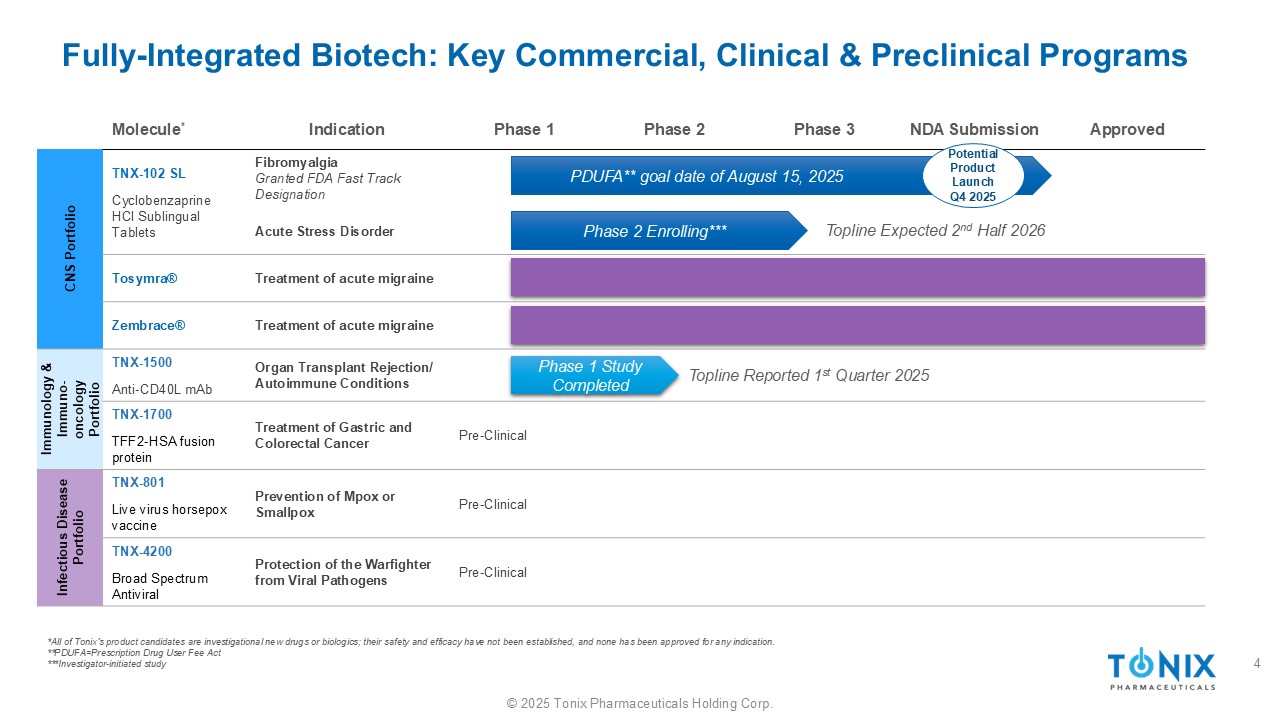 ©2025 Tonix Pharmaceuticals Holding Corp.我们的使命致力于通过发明、开发和提供有影响力的解决方案来改善健康状况,通过强大的内部能力和创造性合作,以解决在规律性疼痛、免疫学/免疫-肿瘤学和传染病方面未得到满足的重要需求。通过可能性赋能患者3