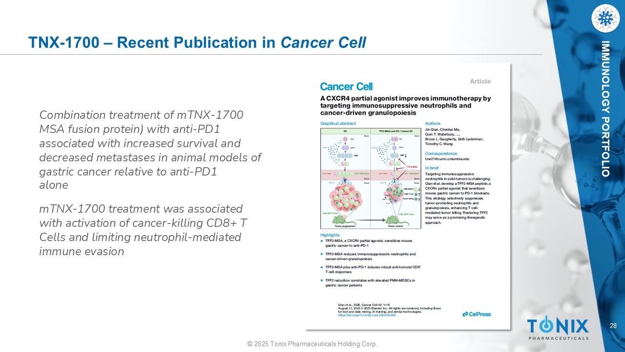 28©2025 Tonix Pharmaceuticals Holding Corp. IMMUNOLOGY PORTFOLIO TNX-1700 –最近发表的癌细胞联合治疗mTNX-1700(mTFF2-丨MSA融合蛋白)与抗PD1抗体在胃癌动物模型中相对于单独的抗PD1治疗与提高生存率和减少转移相关mTNX-1700治疗与激活杀伤癌症的CD8 + T细胞和限制中性粒细胞介导的免疫逃避相关