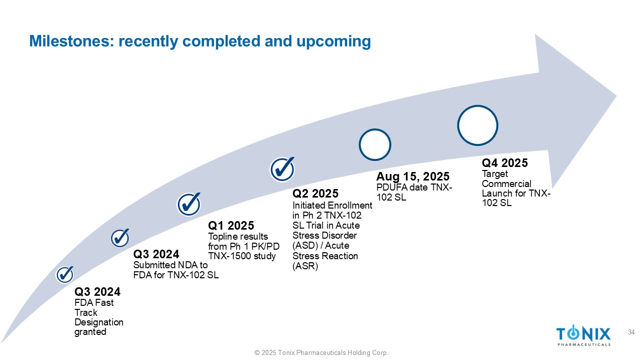 ©2025 Tonix Pharmaceuticals Holding Corp.里程碑:最近完成和即将获得的2024年第三季度FDA快速通道指定授予2024年第三季度向FDA提交TNX的NDA-102 SL-2025 Q1 PH 1 PK/PD TNX-1500研究的顶线结果2025年8月15日PDUFA日期TNX-102 SL-2025 Q4 TNX的目标商业发布-102 SL-2025 Q2在急性应激障碍(ASD)/急性应激反应(ASR)中启动PH2 TNX-102 SL试验的注册34