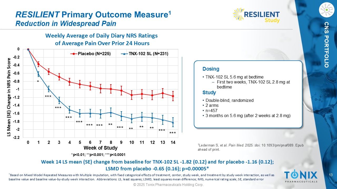12©2025 Tonix Pharmaceuticals Holding Corp. CNS组合CBP直接通过循环系统进入大脑TNX-102 SL绕过首过代谢,导致更快的吸收和减少的norCBP舌下给药TNX-102 SL舌下片迅速崩解、溶解,并将溶解的CBP释放到与粘膜相邻的唾液中,碱基驱动CBP游离碱的形成,游离碱穿过粘膜进入循环系统(经粘膜吸收)经粘膜CBP舌下给药绕过“首过”肝脏代谢,导致更快的吸收和降低norCBP +++++++++ f ++++++不含甘露糖醇的环苯扎普林带电的环苯扎普林Tonix的专有共晶配方含有一种基本成分,可增强有效的经粘膜吸收,从而产生一种具有较长保质期的稳定片剂舌下脉管系统叔胺尾CH 3 N CH 3 CH 3 N CH 3